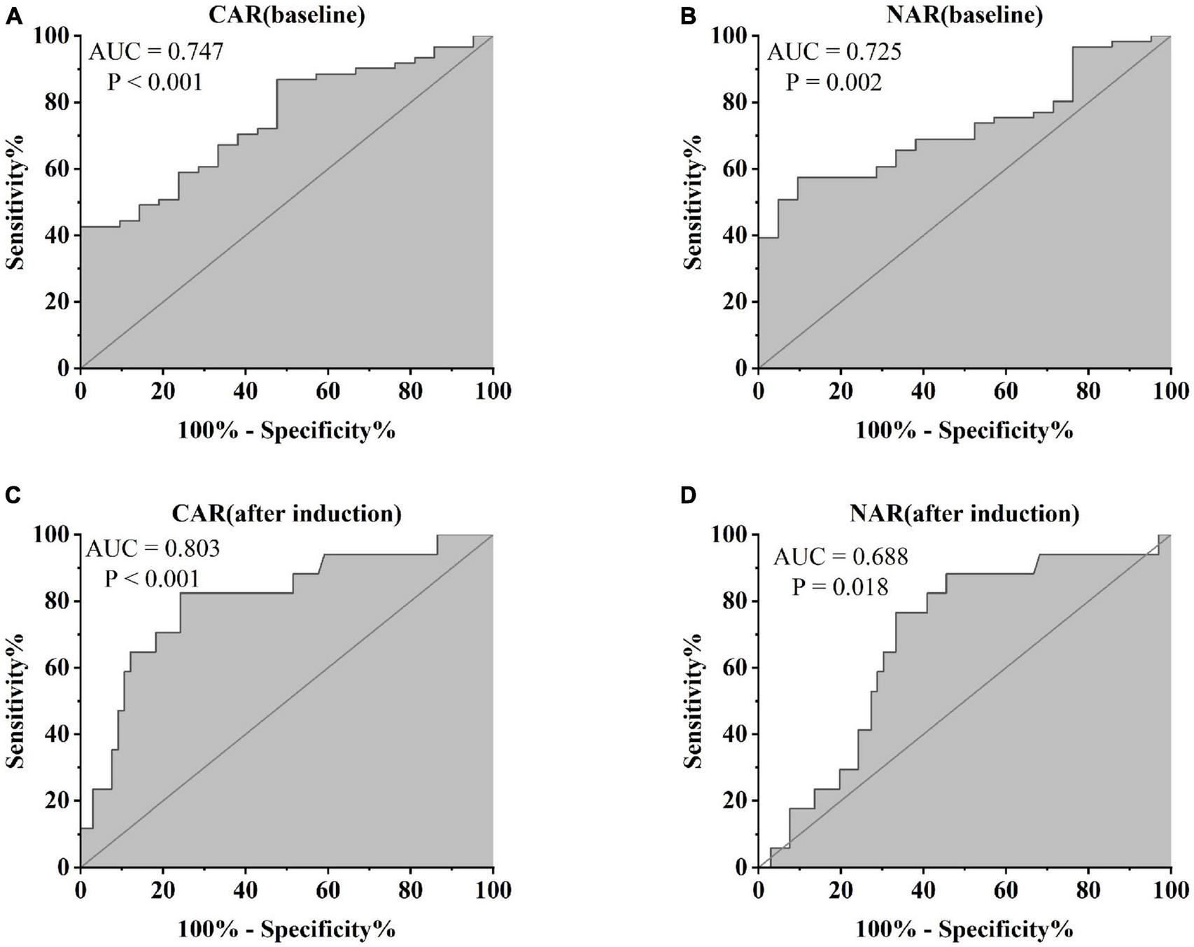 Differences of CAR and NAR between patients who achieve or do not achieve clinical remission. (A) CAR (baseline), the baseline CAR; (B) NAR (baseline), the baseline NAR; (C) CAR (after induction), CAR at the end of induction period; (D) NAR (after induction), NAR at the end of induction period. The comparison of two groups was performed by the Wilcoxon rank sum test [(A) CAR (baseline), P = 0.042; (B) NAR (baseline), P = 0.042; (C) CAR (after induction), P < 0.001; (D) NAR (after induction), P = 0.002].