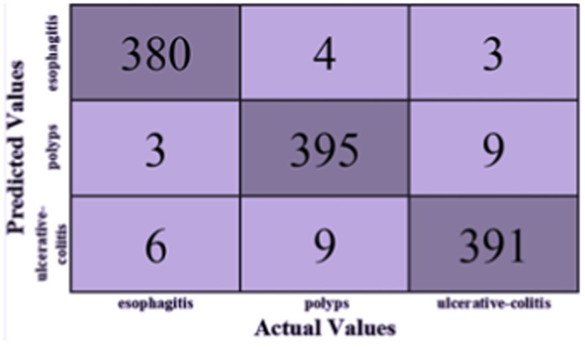 The classification report is shown in Table 2 and contains the F1-score, recall, and accuracy metrics for the ulcerative colitis, polyps, and esophagitis classes. The model’s accuracy is gaged by the F1-score, which unifies recall and precision into a single number. The capacity of the model to accurately identify positive samples is reflected in recall, and the ability to correctly categorize positive predictions is reflected in accuracy. These metrics shed light on how well the model performs for a given class. The classification report and the confusion matrix provide useful data to assess the precision and potency of the created ensemble model in categorizing gastrointestinal lesions.