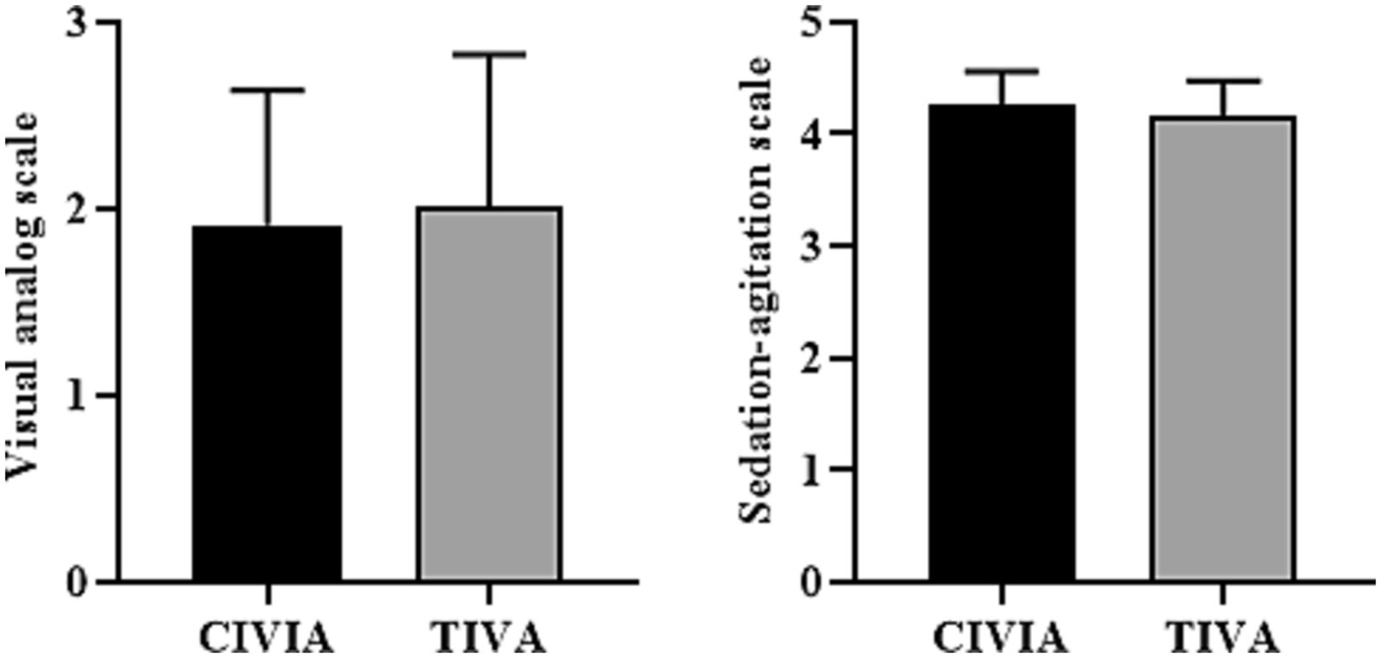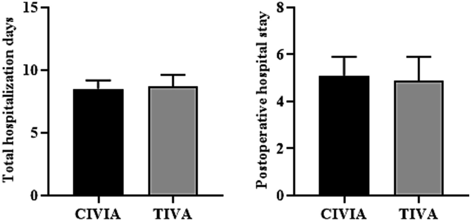 No noteworthy disparities in the fundamental data were observed between the CIVIA and TIVA groups (p > 0.05). Moreover, there were no statistically significant variations in preoperative complications among the two groups (p > 0.05) (Table 1).