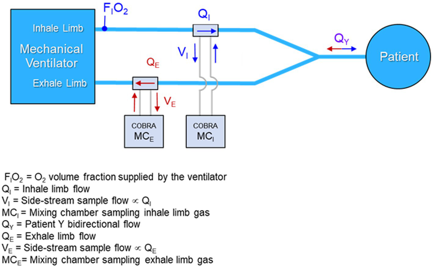 However, placing the COBRA flowtube and associated sample ports in the patient Y increases dead space, which reduces the efficacy of ventilatory support, and adds respiratory burden, sample tubes, and additional weight to the patient Y. These negative attributes of sampling at the patient Y are tolerable, but not desirable, and even less so when aiming to monitor metabolism continuously, rather than via infrequent, spot-check measurements. Consequently, it was decided to locate the sample port that feeds the mixing chamber in the exhale limb of the ventilator as illustrated in Figure 2 rather than in the patient Y. Table 1 summarizes the performance trades associated with the location of the the sample port.