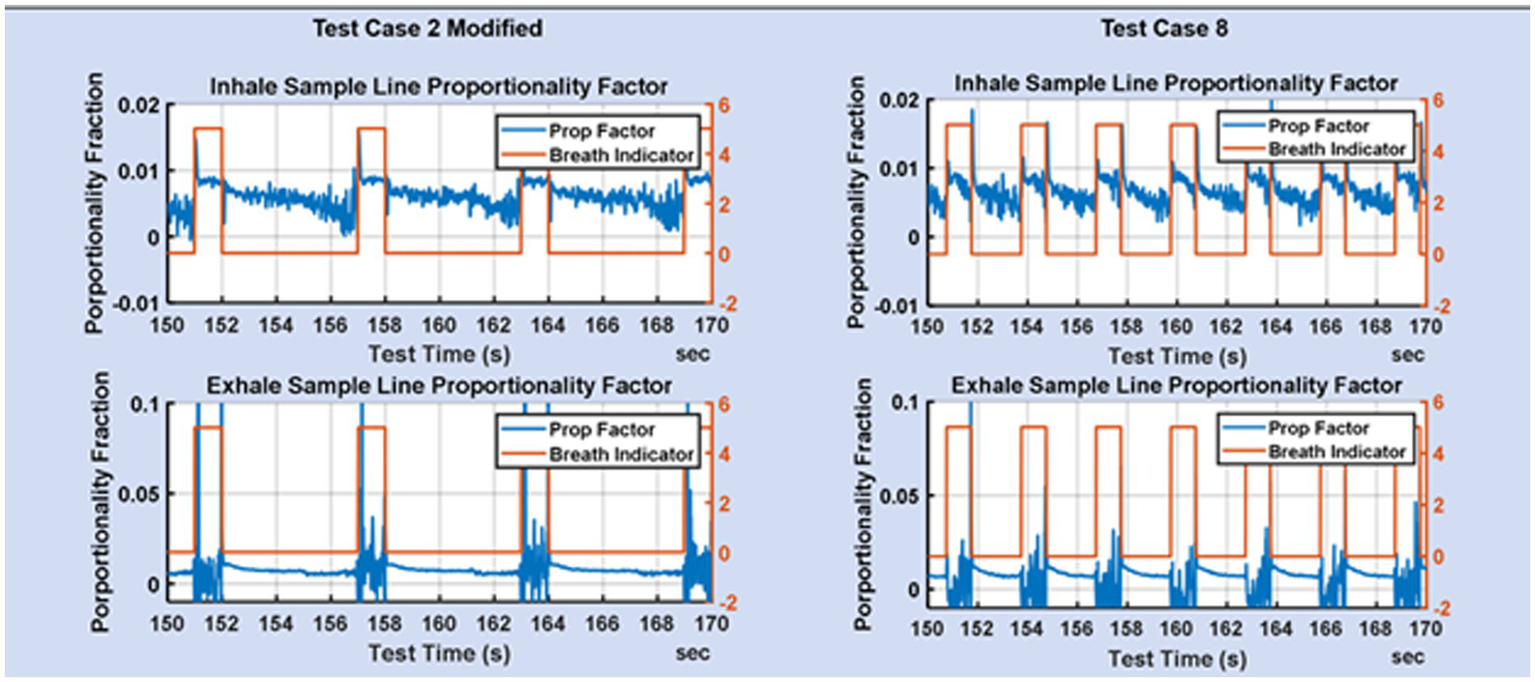 Figure 5 shows the proportionality achieved for test cases 2 and 8. The breath indicator goes high during the inhale phase and low during the exhale phase. During inhale, the flow in the exhale limb of the ventilator is low and consequently the flow measurements are noisier, but also of less consequence. During exhale, the flow on the inhale limb is low resulting in noisier flow measurements. The desire is for flow-rate proportionality on the inhale line during inhale, and flow-rate proportionality on the exhale line during exhale. It is not necessary that the proportionality constants be the same on the inhale and exhale lines, since that does not impact the gas fractions measured in the mixing chamber.