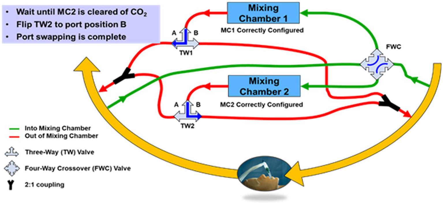 Two three-way valves to enable swapping the output port of the mixing chamber to opposite limbs (input vs. output) of the ventilator circuit