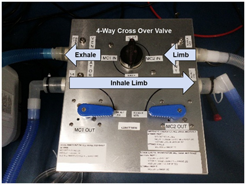 Inclusion of a manually-operated four-port crossover valve to enable swapping the input sample port of each mixing chamber to opposite limbs (input vs. output) of the ventilator circuit