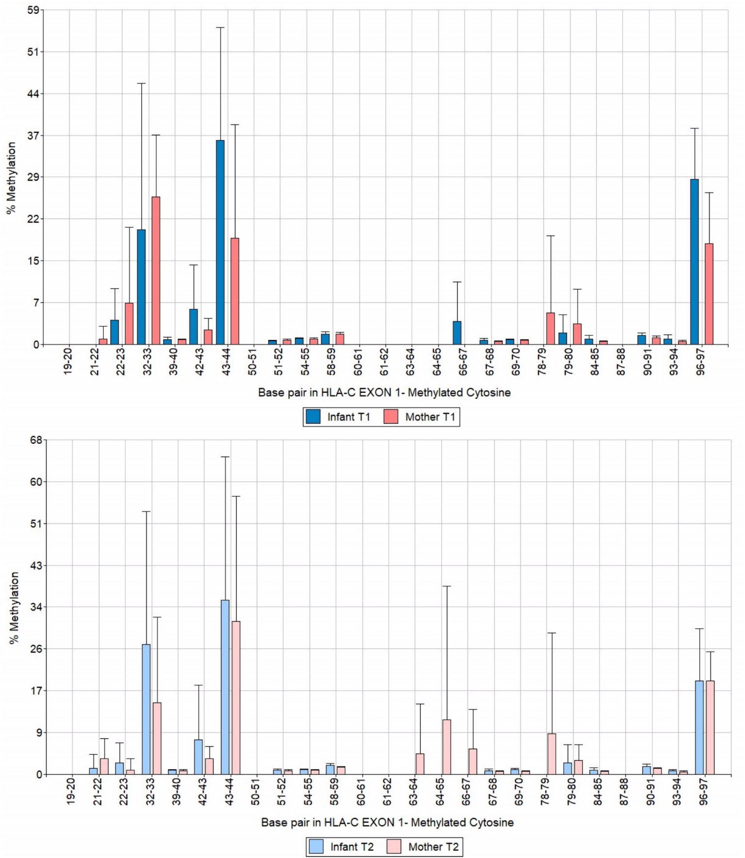 Bar chart of HLA-C exon 1 methylation patterns of infants and mothers contrasting T1 and T2 times.