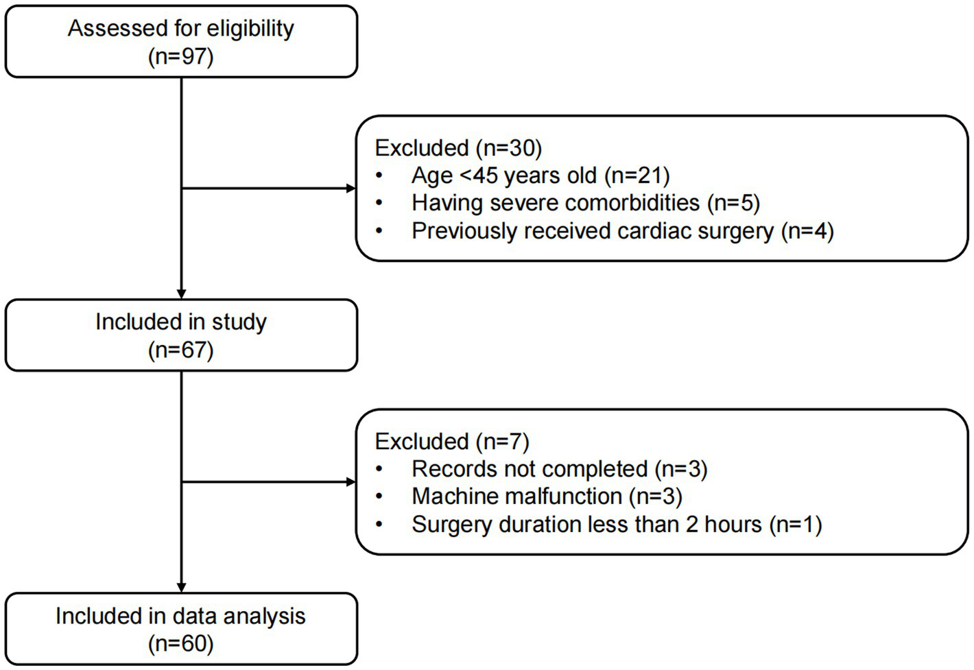 Between November 22, 2021 and March 7, 2022, 97 patients who were ≥ 45 years old and scheduled to undergo noncardiac surgery at our institute were screened, among which 67 patients were successfully enrolled in this study. Nevertheless, 7 patients were excluded from the final data analysis because of the following reasons: incomplete data records (n = 3), machine malfunction (n = 3), and surgery duration of less than 2 h (n = 1). Therefore, 60 patients were included in the final data analysis (Figure 2).