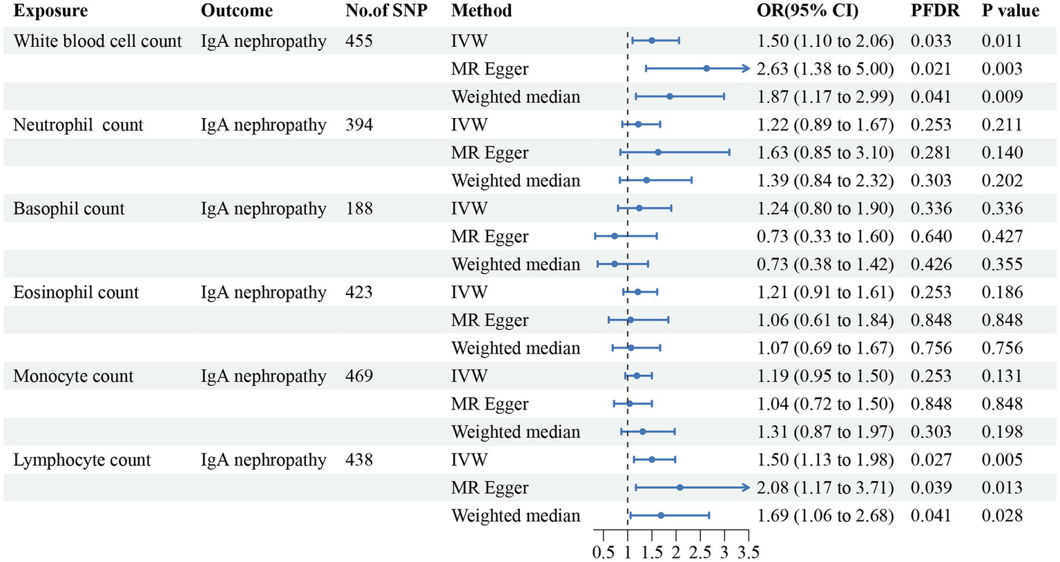 Forest plot for the causal estimates of circulating cell traits on the risk of IgA nephropathy. SNP, single nucleotide polymorphism; IVW, inverse variance weighted; OR, odds ratio; 95% CI, 95% confidence interval; PFDR, p-value after false discovery rate correction.