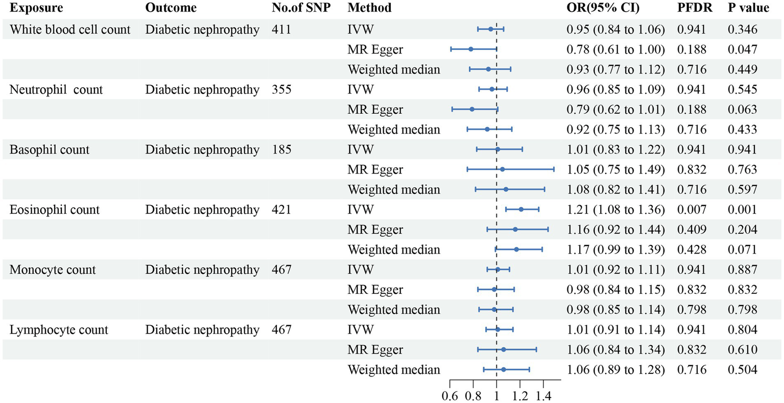 Forest plot for the causal estimates of circulating cell traits on the risk of diabetic nephropathy. SNP, single nucleotide polymorphism; IVW, inverse variance weighted; OR, odds ratio; 95% CI, 95% confidence interval; PFDR, p-value after false discovery rate correction.