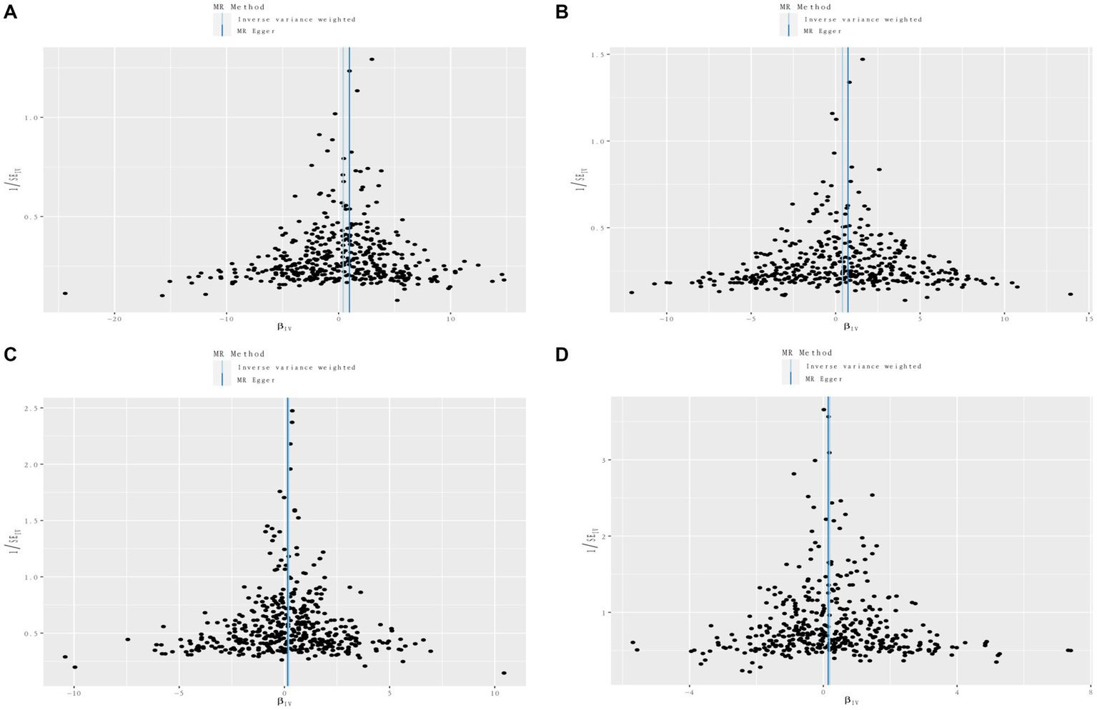 Funnel plots of circulating cell traits genetic variants and renal disorders. (A) Funnel plot of white blood cell count and IgA nephropathy. (B) Funnel plot of lymphocyte count and IgA nephropathy. (C) Funnel plot of white blood cell count and renal malignant neoplasms. (D) Funnel plot of eosinophil count and diabetic nephropathy.
