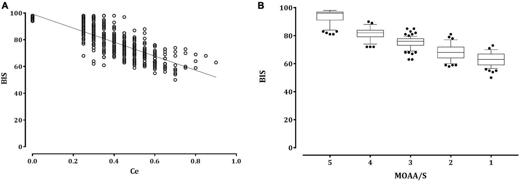 The relationship between the remimazolam effect-site concentration or sedation scale and the bispectral index. (A) Distribution of the bispectral index (empty circle) with the remimazolam effect-site concentration (Ce). The solid lines represent the linear regression of the bispectral index versus remimazolam Ce. (B) Box and whisker plots of BIS and Modified Observer’s Assessment of Alertness/Sedation scale scores. The upper and lower limits of the box indicate the 75th and 25th percentiles of the sample, respectively, and the horizontal line inside each box indicates the median. The upper and lower notches indicate the 90th and 10th percentiles of the samples, respectively. The values below and above the notches were drawn as individual points. BIS, bispectral index; Ce, effect-site concentration; MOAA/S, Modified Observer assessment of the alertness/sedation scale.