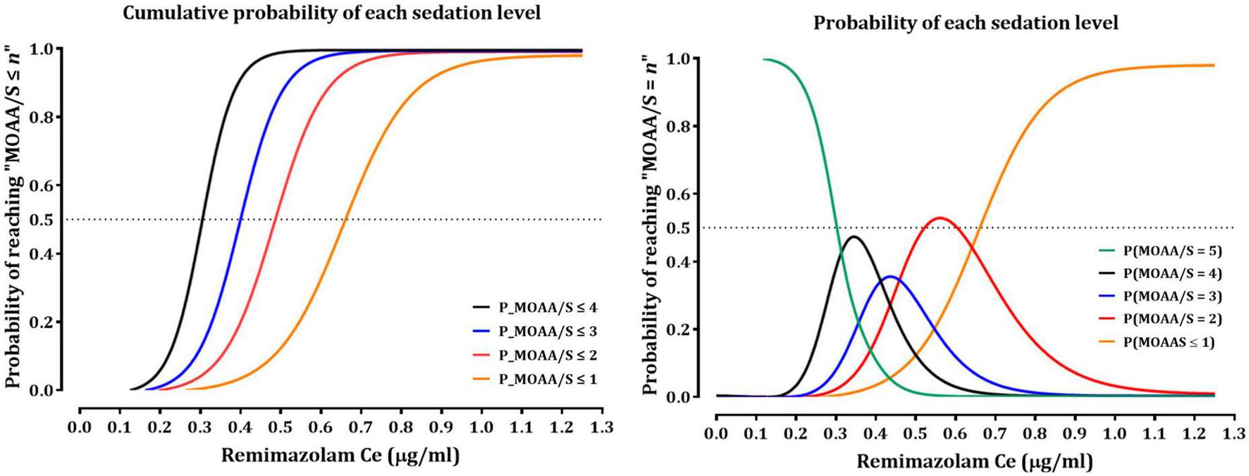 Probability of reaching each MOAA/S scale being equal to less than a given level (MOAA/S ≤ n) and each MOAA/S scale being equal to a given level (MOAA/S = n) as a function of predicted remimazolam effect site concentration based on the final pharmacodynamic model. MOAA/S, Modified Observer’s Alertness/Sedation scale; Ce, effect-site concentration.