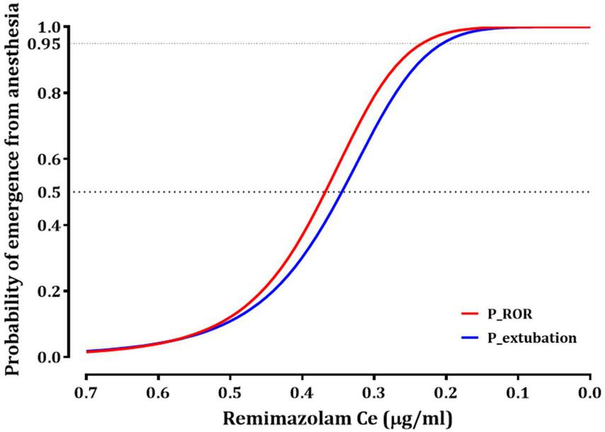 The relationship between the probability of recovery of responsiveness (ROR) or endotracheal extubation and effect-site concentration of remimazolam. Ce50ROR and Ce95ROR (effect-stie concentration of remimazolam, associated with 50 and 95% probability for ROR, respectively) are 0.368 and 0.232 μg/ml; Ce50extubation and Ce95extubation (effect-stie concentration of remimazolam, associated with 50 and 95% probability for extubation, respectively) are 0.345 and 0.204 μg/ml.