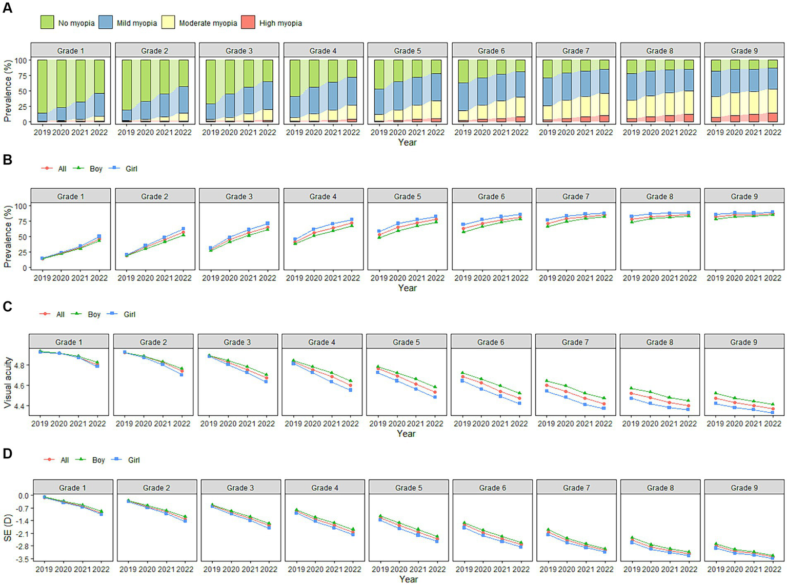 During the 4-year follow-up period, the uncorrected visual acuity (UCVA) of the study subjects progressed following a trend of −0.18 ± 0.30D (−0.17 ± 0.29D for boys, −0.21 ± 0.32Dfor girls) (p < 0.001). Those students who were in grade 4 aged 9–10 years at the baseline examination showed the greatest decline in visual acuity (0.23). The SE of the study subjects progressed following a trend of −1.00 ± 1.27D (−0.96 ± 1.25D for boys, −1.05 ± 1.31D for girls) (p < 0.001). The students who were in grade 5 aged 10–11 years at the baseline examination showed the greatest decline in SE (1.15D ± 1.22, p < 0.001). The prevalence of myopia (UCVA<5.0 and SE < –0.50D of any eye) increased by 28.2% (27.0% for boys and 29.8% for girls). Those students who were in grade 2 aged 7–8 years at the baseline examination showed the greatest increase in myopia prevalence (37.6%, p < 0.001). During the COVID-19 pandemic, the subjects’ visual acuity and SE measurements decreased by −0.05 ± 0.19 (p < 0.001) and − 0.36 ± 0.89D (p < 0.001) respectively, and the prevalence of myopia increased by 11.3% (10.6% for boys and 12.2% for girls) (p < 0.001). The 3-year cumulative incidence of myopia for non-myopic grade 1 aged 6–7 years students with baseline SE of ≥1.00D, ≥ 0.50D and < 1.00D, ≥0D and < 0.50D, and ≥ −0.50D and < 0D were 6.8, 24.8, 39.0, and 48.1%, respectively.