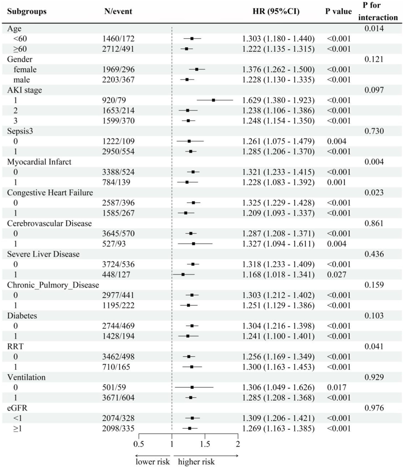 Kaplan–Meier survival curves showed that a higher SF value was significantly associated with an enhanced risk of 28-day mortality, 90-day mortality, ICU mortality and hospital mortality (log-rank test: p < 0.001 for all clinical outcomes). In multivariate Cox regression analysis, high level of SF with mortality was significantly positive in all four outcome events (all p < 0.001). This result remains robust after adjusting for all variables. Subgroup analysis of SF with 28-day mortality based on Cox model-4 showed that high level of SF was associated with high risk of 28-day mortality in patients regardless of the presence or absence of sepsis (p for interaction = 0.730). Positive correlations of SF and 28-day mortality were confirmed in all other subgroups (p for interaction>0.05).