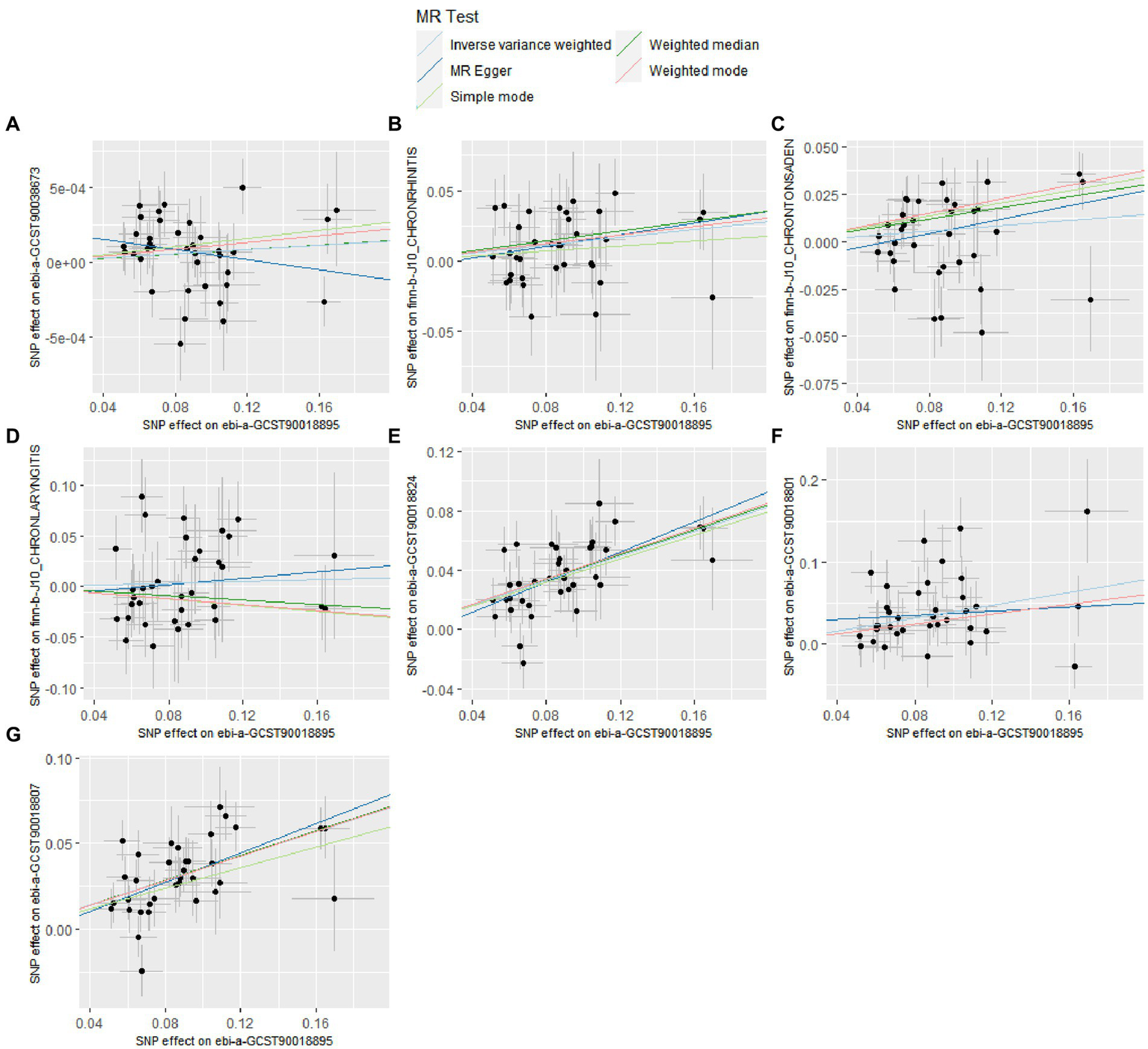 Scatter plot for the causal effect of pediatric asthma on the risk of UAD. (A) Chronic sinusitis; (B) Chronic rhinitis, nasopharyngitis and pharyngitis; (C) Chronic diseases of tonsils and adenoids; (D) Chronic laryngitis and laryngotracheitis; (E) Chronic bronchitis; (F) Bronchiectasis; (G) Chronic obstructive pulmonary disease.