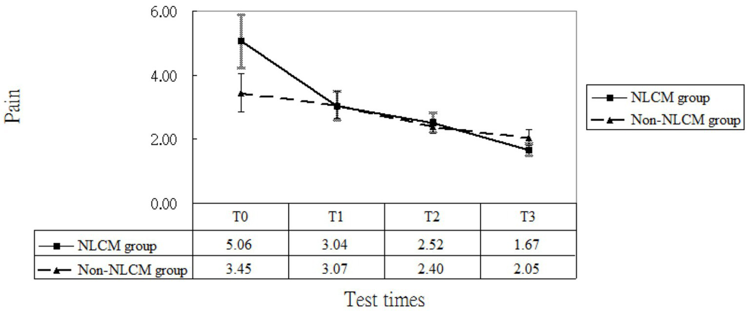 Pain levels of patients in the NLCM and the control groups.