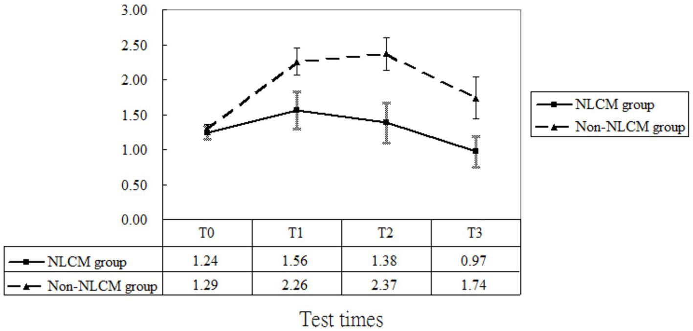 Furthermore, to minimize the baseline imbalances in this comparative study, we carried out one sensitivity analysis where each selected NLCM case was randomly matched to one control without NLCM use via the propensity score matching (34). The propensity score was calculated using logistic regression derived from patients’ demographics and baseline comorbidities at enrollment. Thereafter, a total of 26 NLCM users and 26 control users were included after propensity score matching and no conspicuous differences were found between the two groups, indicating the matched intervention and comparison groups were comparable in terms of baseline characteristics. The reanalysis based on the GEE procedure indicated that NLCM was still significantly related to reductions in levels of pain (T1 = −2.54, p < 0.01; T2 = −2.20, p = 0.03; T3 = −1.92, p = 0.04), fatigue (T1 = −1.27, p = 0.02; T2 = −1.31, p = 0.01; T3 = −1.25, p < 0.01), and CRP (T1 = −0.36, p = 0.03; T2 = −0.51, p = 0.01; T3 = -0.31, p = 0.02), among the enrollees.