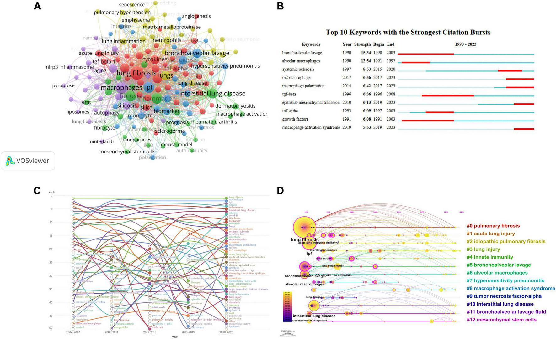 During the period from 2004 to 2007, the keywords “lung fibrosis,” “macrophages,” “ipf,” and “silicosis” entered the top 50 for the first time. Over time, their rankings exhibited an upward trend, suggesting an increasing attention to PF and macrophages.
