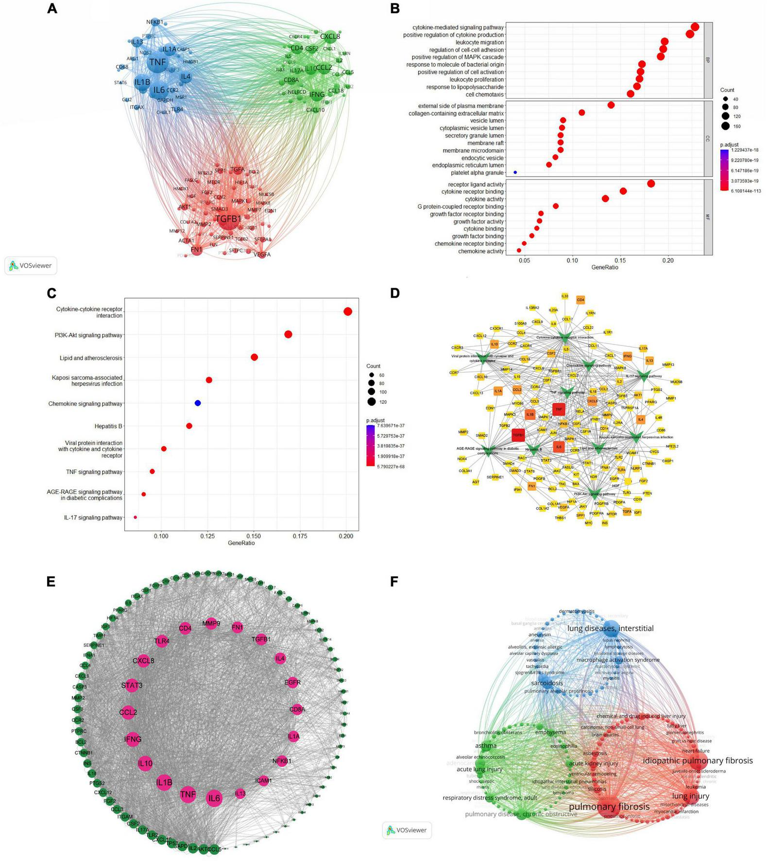 Using VOSviewer software, co-occurrence clustering analysis of genes associated with macrophages and PF research was conducted. The Citexs Big Data platform extracted a total of 3,299 genes from 3,479 articles, setting a minimum occurrence threshold of 30 times for each gene (authors meeting these criteria were included in the visualization) (Figure 6A). The resulting visual map comprises nodes represented by circles and labels, with the size of each circle proportional to the frequency of gene occurrence. The thickness of lines connecting circles reflects the strength of relationships between genes. Different-colored nodes form distinct clusters, representing gene clusters in different domains. Notably, the red cluster is led by TGFβ1, the blue cluster by TNF, and the green cluster by CXCL8, each exhibiting the highest popularity within their respective gene clusters. Complete data can be found in Supplementary Table 11.