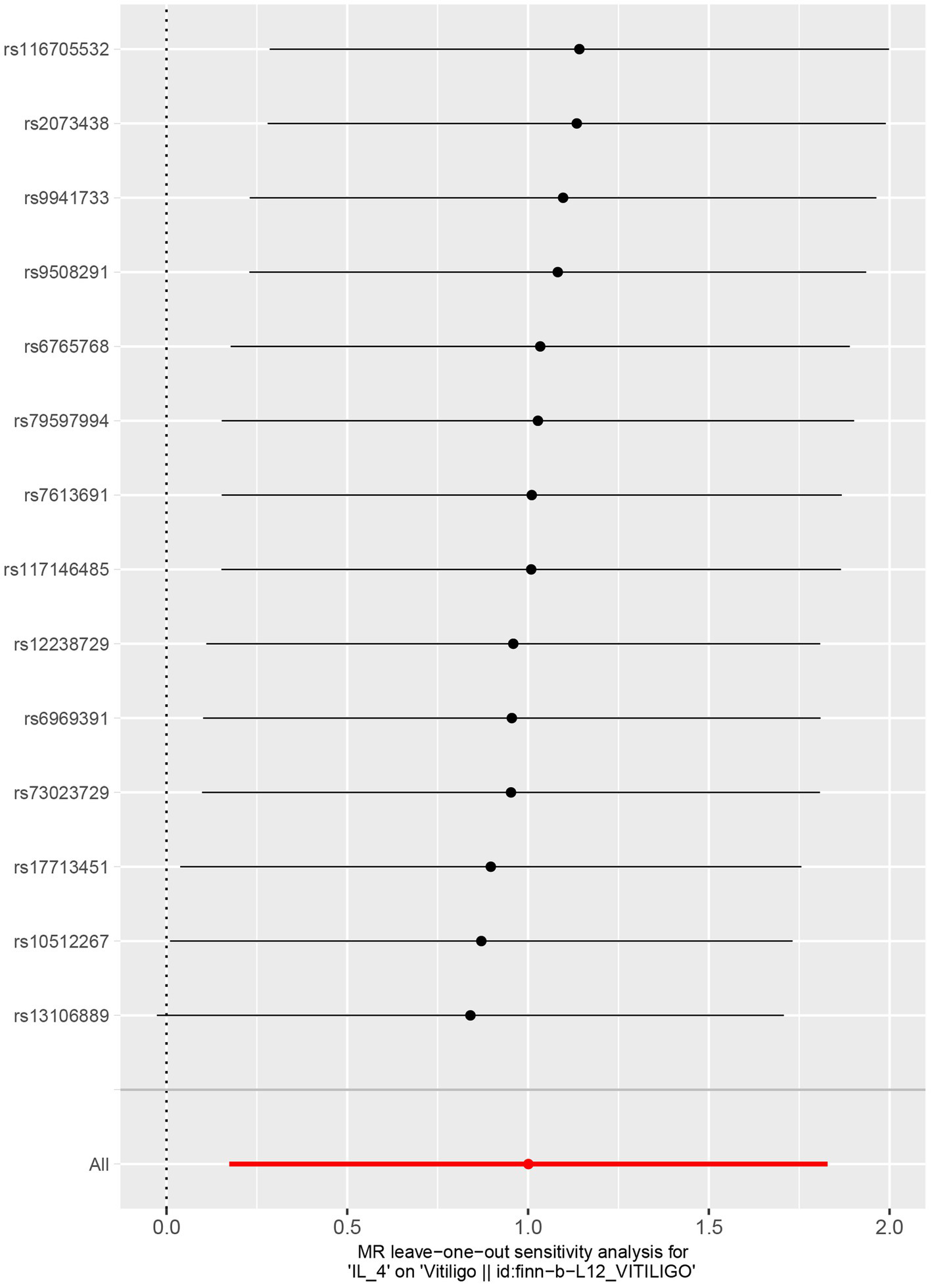 We observed that rising IL-4 levels generated an enhanced probability of vitiligo in IVW (OR 2.72, 95%CI 1.19–6.22, p = 0.018). According to the results of the MR analysis, there were causal links between IL-4 and vitiligo. Results were steady after sensitivity and heterogeneity analyses.
