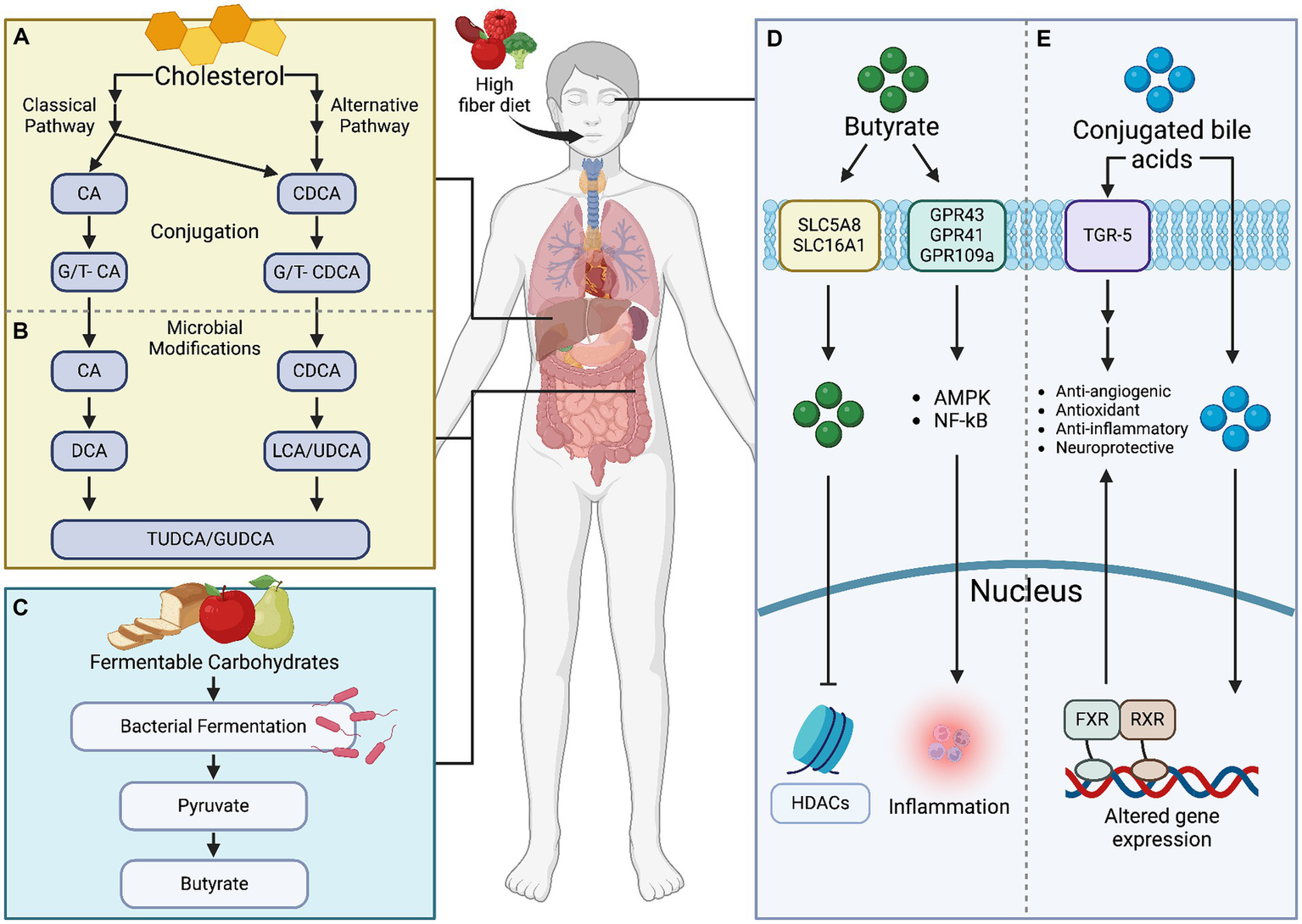 Microbial metabolites, specifically bile acids and butyrate, exert significant influence on retinal health. (A) Bile acids, produced through cholesterol metabolism, impact retinal inflammation, vascular function, and oxidative stress. Meanwhile, (B) butyrate, a short-chain fatty acid, modulates (C–E) immune responses and neuronal survival within the retina. Understanding these metabolites’ roles is crucial for developing targeted therapies to mitigate retinal pathologies. Created with BioRender.com.
