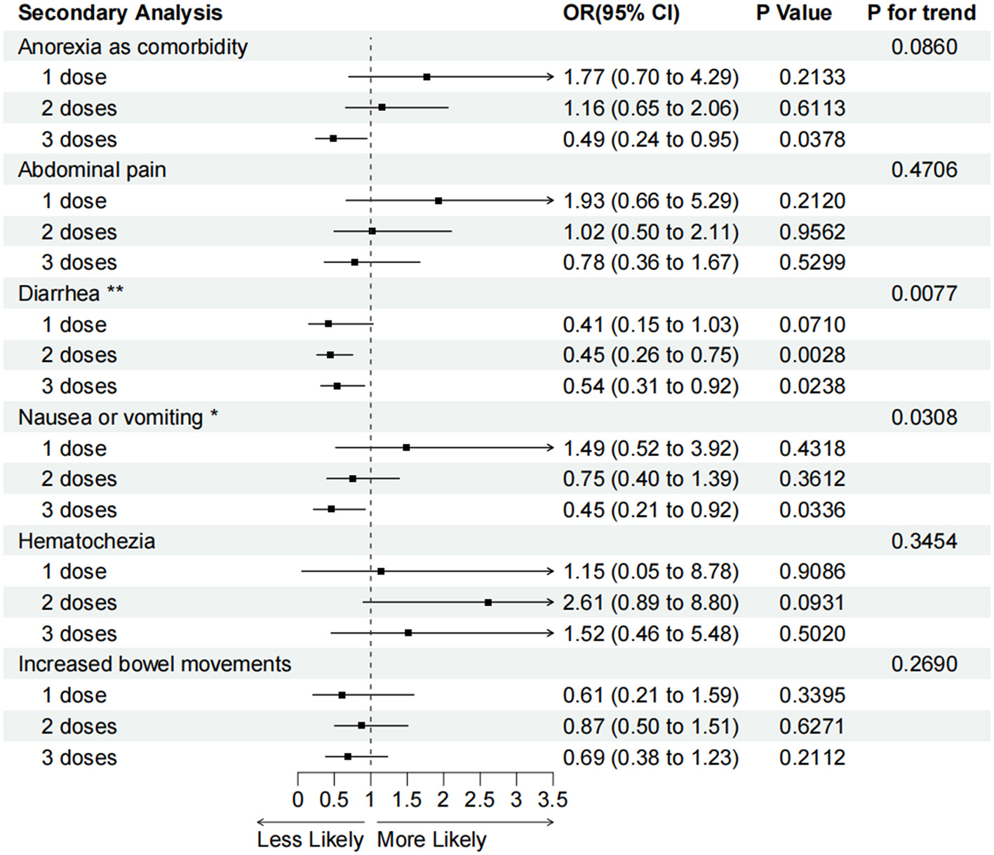 Figure 4. Adjusted odds ratios (95% confidence intervals) for various GI symptoms associated with one, two, or three vaccination doses compared with the unvaccinated. OR (95% CI), P-values and P for interaction are calculated in the adjusted model. *P for trend < 0.05, **P for trend <0.01.