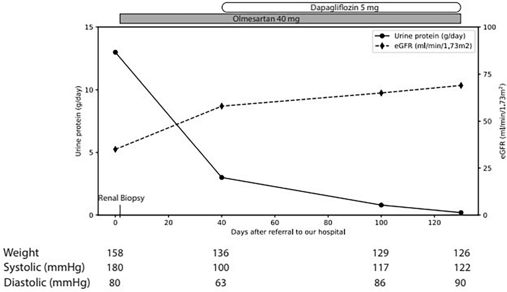 The physical examination revealed a blood pressure of 165/65 mmHg, heart rate of 63/min with correct peripheral saturation on room air and a severe anasarca. Laboratory revealed an acute kidney injury (serum creatinine 163 μmol/L, eGFR 36 ml/min), a nephrotic syndrome (proteinuria of 13 g/day, serum albumin 15 g/l [35–52 g/l], triglycerides 3.47 mmol/l [<1.7 mmol/l], LDL-cholesterol 6.28 mmol/l [<3.35 mmol/l]) with a bland urinary sediment. HbA1c excluded diabetes. Immunological markers (anti-nuclear antibodies, antiglomerular basement membrane antibodies, anti-neutrophil cytoplasmic antibodies, anti-dsDNA, anti-histon, anti C1q) and the viral serologies (human immunodeficiency virus, hepatitis B and C) were negative. C3 and C4 and serum protein electrophoresis were normal; immunofixation of immunoglobulins in serum revealed no monoclonal protein. Ultrasound showed normal-sized kidneys with maintained corticomedullary differentiation without obstruction. Percutaneous renal biopsy (Figures 1A, B) revealed 30 glomeruli with diffuse expansion of mesangial matrix and with partial nodular configuration. Additionally, a moderate acute tubular injury was present. Masson trichrome and Congo red stains yielded negative results. Immunofluorescence was negative for immune deposits and electron microscopy showed thickening of glomerular basement membrane (580 nm) and foot process effacement. There was minimal arteriosclerosis and low-grade arteriolohyalinosis. Considering the patient’s medical history, laboratory results, and histological findings, a diagnosis of ING was established. Subsequently, antiproteinuric treatment involving olmesartan and dapagliflozin was initiated, alongside temporary diuretic therapy to restore euvolemia (Figure 2). The patient did not quit smoking and lost 32 kg, initially due to diuretic treatment and later intentionally. Patient follow-up has been favorable, showing blood pressure control; improvement in renal function at 3 months (serum creatinine 95 μmol/L, eGFR 69 ml/min) and resolution of nephrotic syndrome with residual proteinuria of 0.8 g/day.