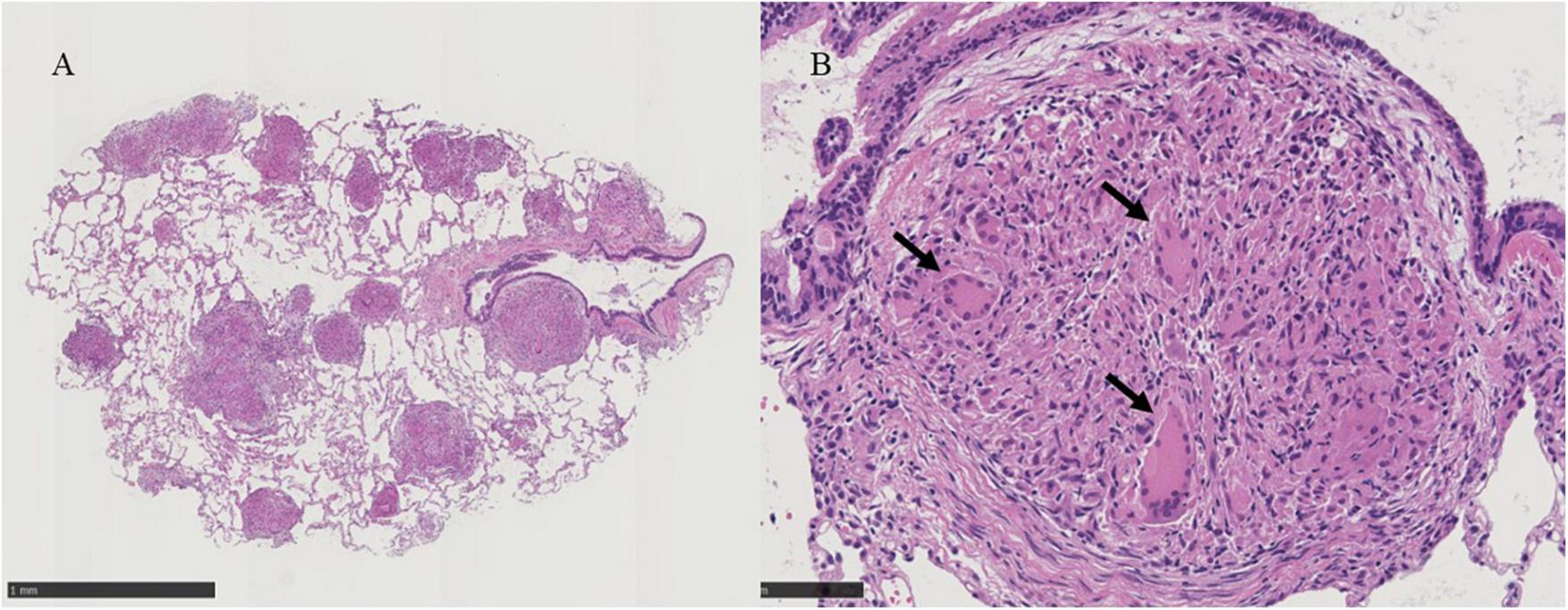 (A) Histological examinations of the lung tissue obtained by transbronchial lung cryobiopsy show non-caseating epithelioid granulomas scattered around the alveolar septum, bronchi, vessels and large complex of granulomas without inter granulomatous sclerosis at X30 magnification, black scale bar = 1mm. (B) Prominent epithelioid cells and multinucleated giant cells around bronchioles are indicated by black arrows in the panel at X200 magnification, black scale bar = 100 μm.