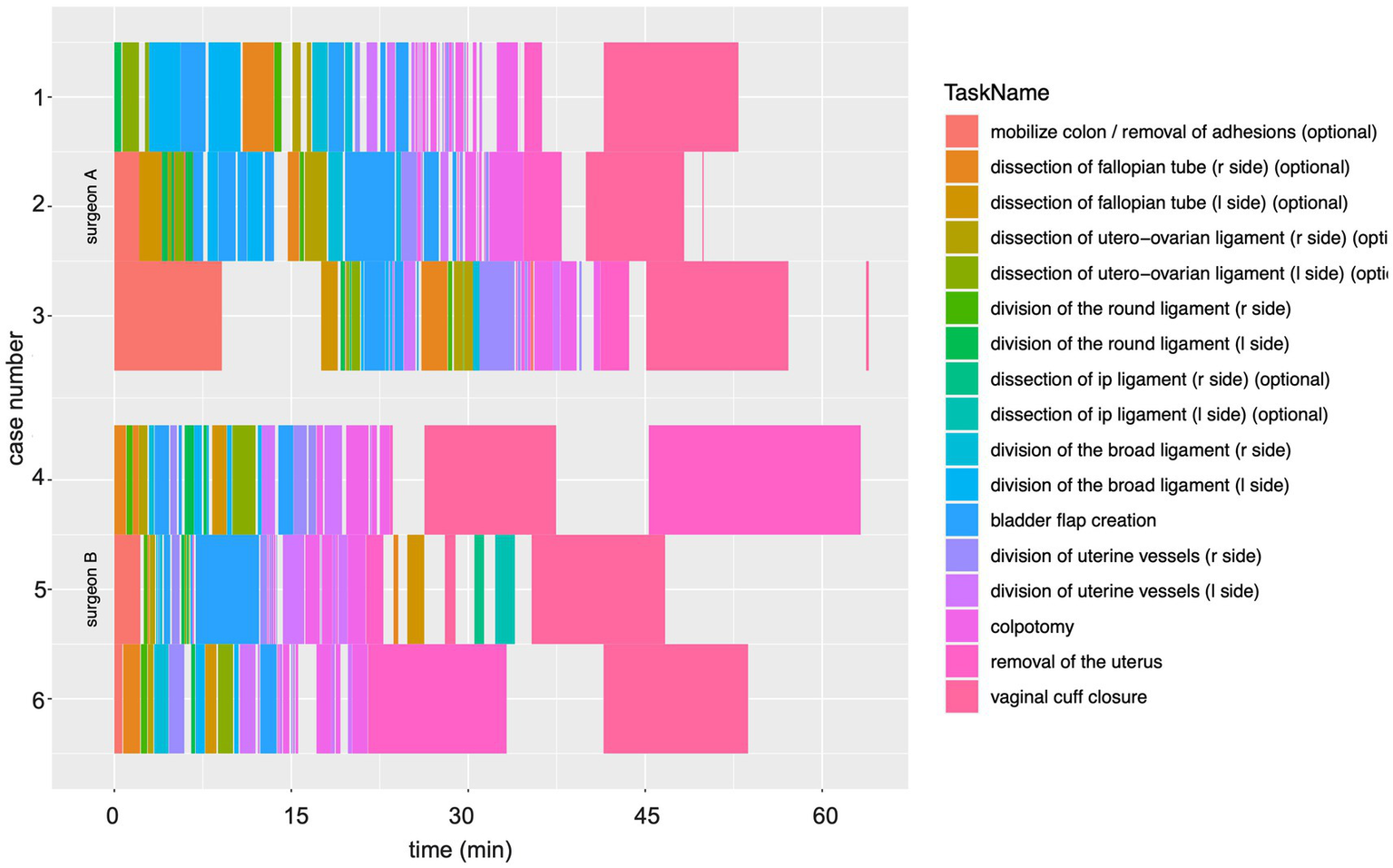 Individual differences across cases can be observed, as well. In surgery no. 3, extensive adhesiolysis was performed at the beginning of the procedure (Figure 2, broad orange bar). This may not be required in all cases, as variable presence of adhesions may eliminate the need for this step. Additionally, surgery no. 4 exhibits a longer duration for removal of the uterus, which follows the colpotomy. This case represents a patient with a large uterus myomatosus, which could not be retrieved through the vagina, so a laparoscopic morcellation was performed. This is similar to surgery no. 6, although the removal of the uterus is in reverse order to surgery no. 4. In this particular surgery, a vaginal morcellation was performed for large uterus myomatosus followed by laparoscopic suturing of the colpotomy. Together, this visualization uncovers both similarities and differences in individual hysterectomies and reflects unique components to aide in analysis of surgical workflow. Patient characteristics are displayed in Table 2.