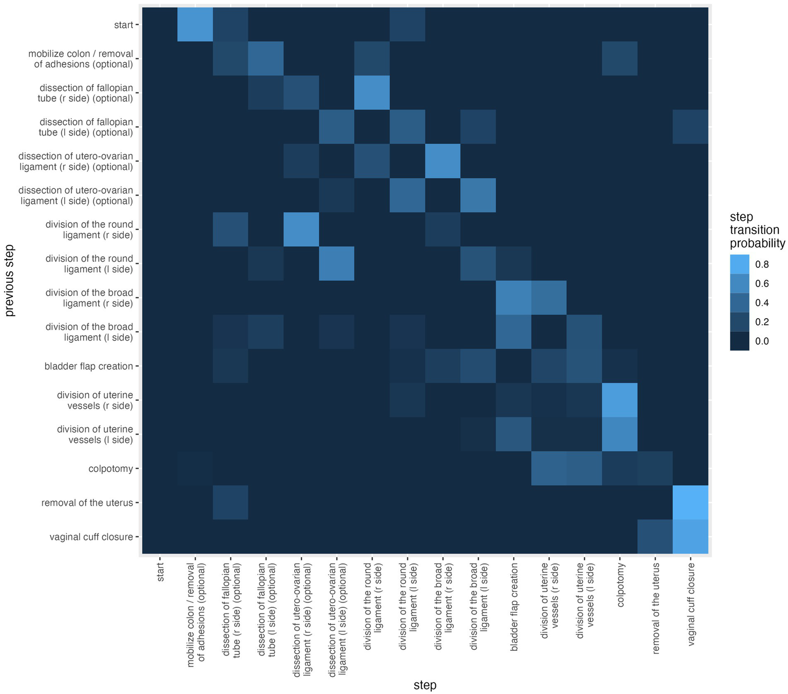 Figure 3 shows the probability of the sequence of the surgical steps of all six rTLH surgeries. Lighter squares indicate a higher probability and black indicates that the transition never occurred. All surgeries start with the default “start” step and then the next step with highest probability is “mobilize colon/removal of adhesions (optional),” but “dissection of fallopian tube (r side) (optional)” and “division of the broad ligament (r side)” also occur with smaller probability. As most surgeries end with the vaginal cuff closure this square is the lightest in the last line. In one case the uterus was morcellated due to the size after the vaginal cuff closure, so there is also a square indicating the probability of the removal of the uterus which is darker than the one for vaginal cuff closure.