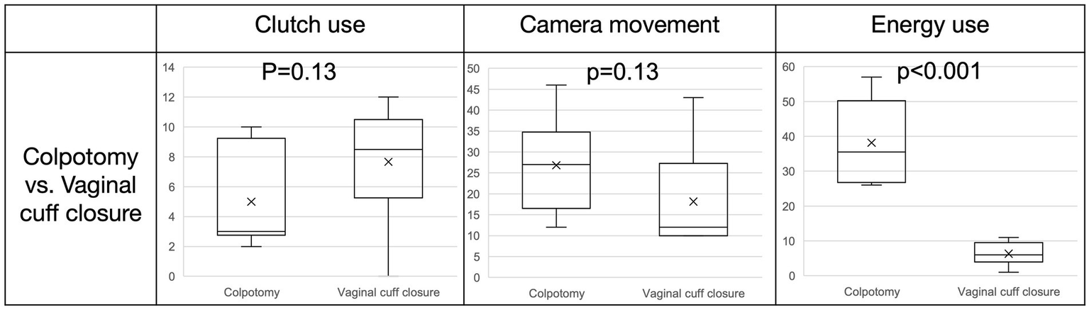 Whisker box plot. Comparison of event counts (clutch use, camera movement and energy use) between colpotomy and vaginal cuff closure for all six surgeries.