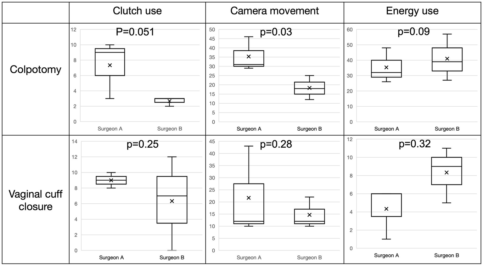 Event counts for clutch use, camera movements, and energy use can be compared across surgeons for specific steps. Box and whisker plots comparing event counts of clutching, camera movements, and energy use during colpotomy (top) and vaginal cuff closure (bottom) for Surgeon A and B during rTLH. “x” represents mean.