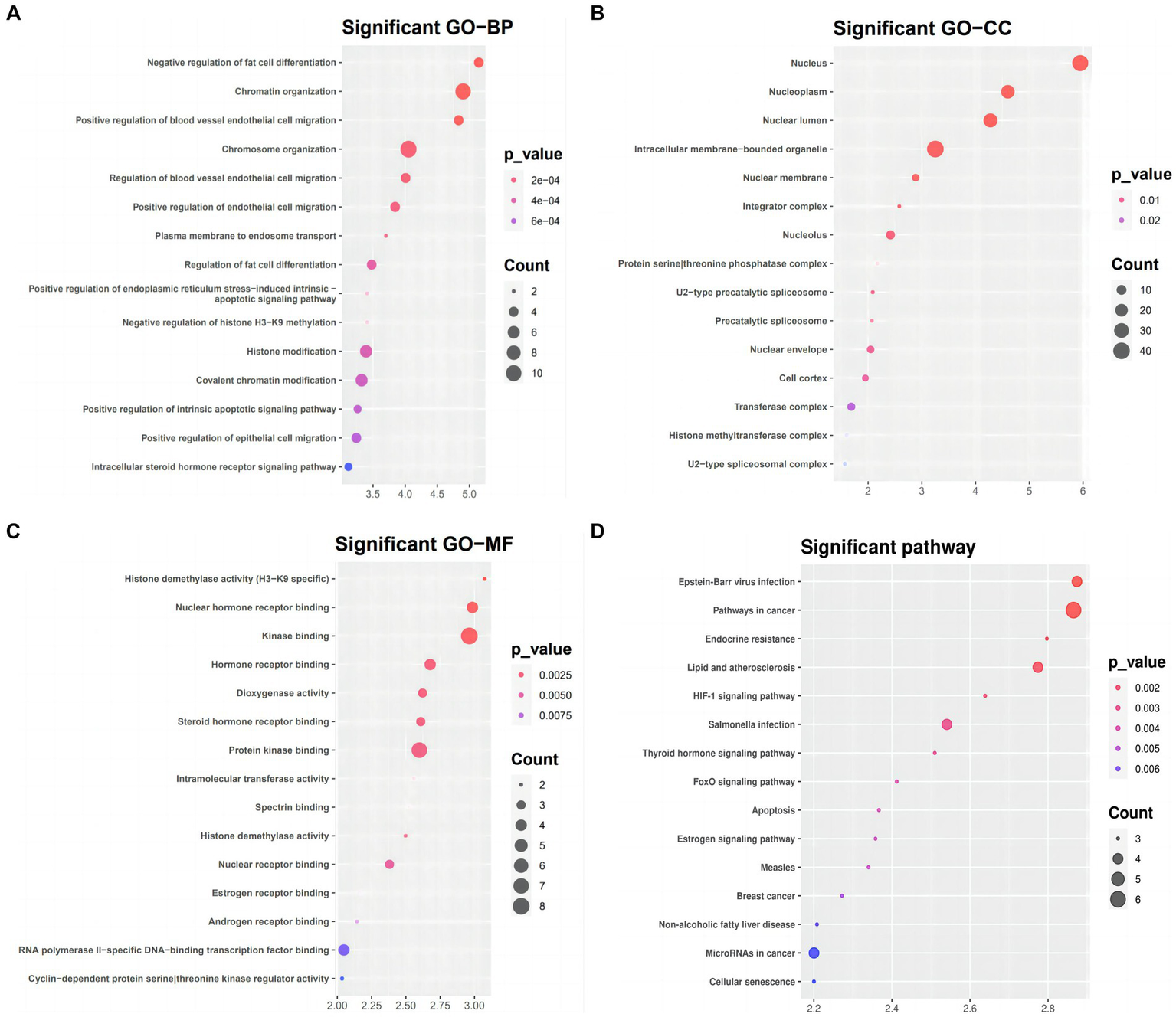 We used DAVID to conduct functional and pathway enrichment analyses to gain more insight into the biological roles of the 51 DEmRNAs implicated in SLE. The top 15 KEGG pathways and enriched GO terms were exhibited in Figure 5. The GO analysis revealed that DEGs were primarily enriched in the following categories: “chromatin organization,” “chromosomal organization,” and “the negative regulation of fat cells” (BPs); “intracellular membrane-bounding organelle,” “nuclear lumen,” and “nucleotic” (CCs); and “kinase binding,” “protein kinase binding,” “RNA polymerase II-specific DNA binding transcription activator activity” (MFs). KEGG pathway analysis presented that DEGs of ceRNA network of SLE were enriched in malignancies, infection, Lipid and atherosclerosis, apoptosis, endocrine resistance, FoxO signaling, HIF-1 signaling, Estrogen signaling and thyroid hormone signaling (Figure 5D).