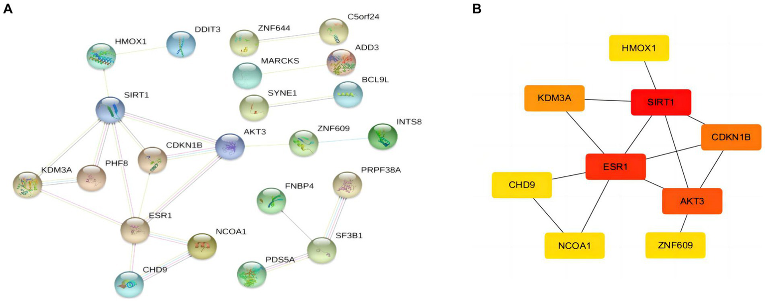 After obtaining the target mRNA of ceRNA network in SLE, 51 DEmRNAs were imported into the PPI network composed of 51nodes and 22edges (Figure 6A). Following the identification of the vital functions of hub genes in the network, we used MOCDE plugin of cytoscape for further analysis, and 9 hub genes were explored (HMOX1, SIRT1, ESR1, AKT3, CDKN18, KDM3A, CHD9, NCOA1, ZNF609).