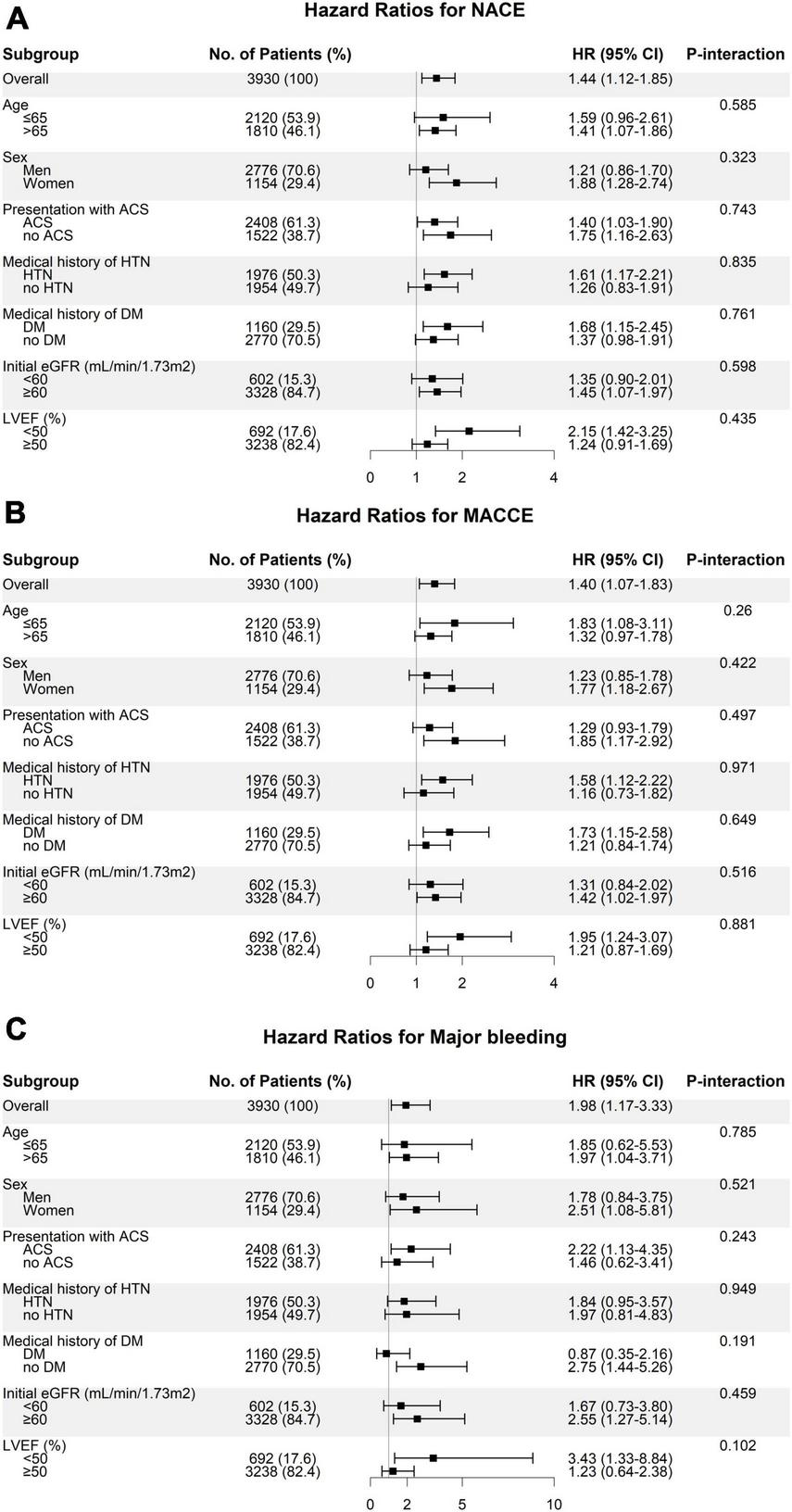 The primary outcome was the occurrence of net adverse clinical events (NACE) within a 4-year period, characterized as a composite of all-cause death, non-fatal myocardial infarction (MI), non-fatal stroke, or major bleeding. Secondary outcomes included major adverse cardiac and cerebrovascular events (MACCE) and major bleeding, both of which were evaluated for up to 4 years. MACCE were defined as a composite of all-cause death, non-fatal myocardial infarction, or non-fatal stroke. Furthermore, major bleeding was specifically defined as Bleeding Academic Research Consortium (BARC) grade 3 or 5 bleeding (24). The other secondary outcomes included each MACCE component.