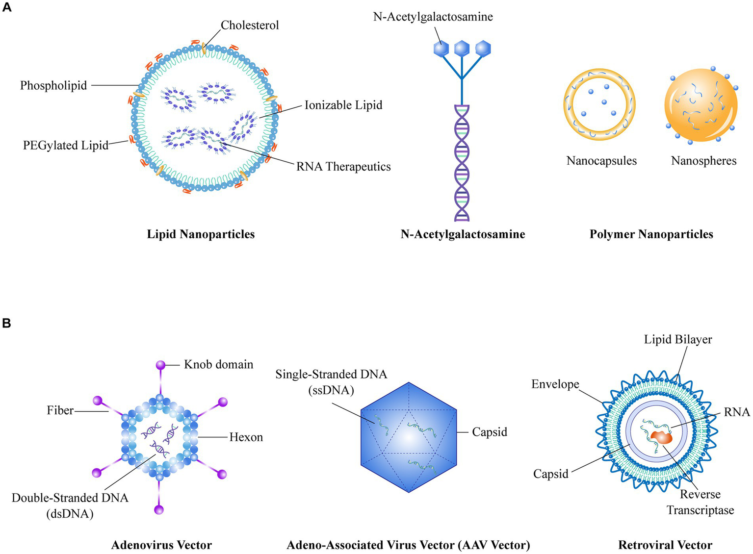 The advent of RNA interference (RNAi) technology has revolutionized the ability to manipulate molecular processes with unprecedented precision (74). Compared to DNA, RNA is less stable and therefore requires more demanding delivery vehicles. Based on the composition of delivery system, RNA delivery vehicles can be broadly categorized into non-viral vectors and viral vectors (Figure 3; Table 4).