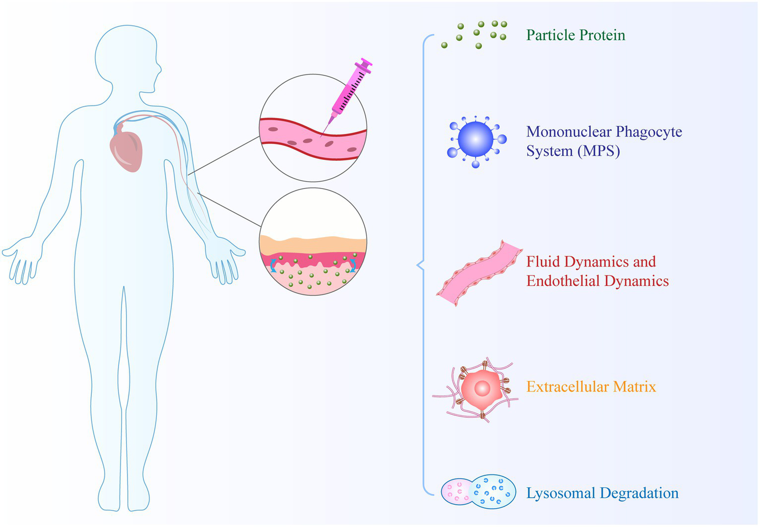 Nanocarrier-based drug delivery systems encounter several biological barriers in drug transport. These transport processes occur within different compartments, such as within the cytoplasm and between compartments. As shown in Figure 4., biological barriers, including cell membranes, nuclear membranes, and endosomal membranes, significantly interfere with drug delivery (87). Firstly, upon contact with biological fluids, NPs accumulate molecules on their surface and form a protein corona. The dynamic multi-layer protein structure of the protein corona provides NPs with specific identities, which can influence their physicochemical properties and subsequent biological interactions and distribution. Secondly, the activation of resident macrophages in the reticulate endothelial system (RES) aids in the clearance of old blood cells and substances carried in the blood circulation to RES organs. A key limitation of nanomedicines is their rapid phagocytosis and clearance based on the RES, resulting in a decrease in the bioavailability of nanodrugs. Thirdly, NPs face complex fluid dynamics when passing through curved and bifurcated regions of healthy or diseased blood vessels (88). Fourthly, the extracellular matrix provides tissues with structural integrity, characterized by high collagen content, rigidity, and tensile strength. It serves as a major natural physical barrier that hinders the delivery of nanodrugs. Finally, once NPs extravasate from blood vessels to the site of infection, they can bind to cell membranes, leading to internalization. This highlights the challenges faced by nanotechnology in drug delivery. However, the development of targeted nanomedicines that can directly deliver drugs to the inflamed site by targeting molecular constituents involved in RA pathophysiology or immune cells can potentially overcome these barriers.