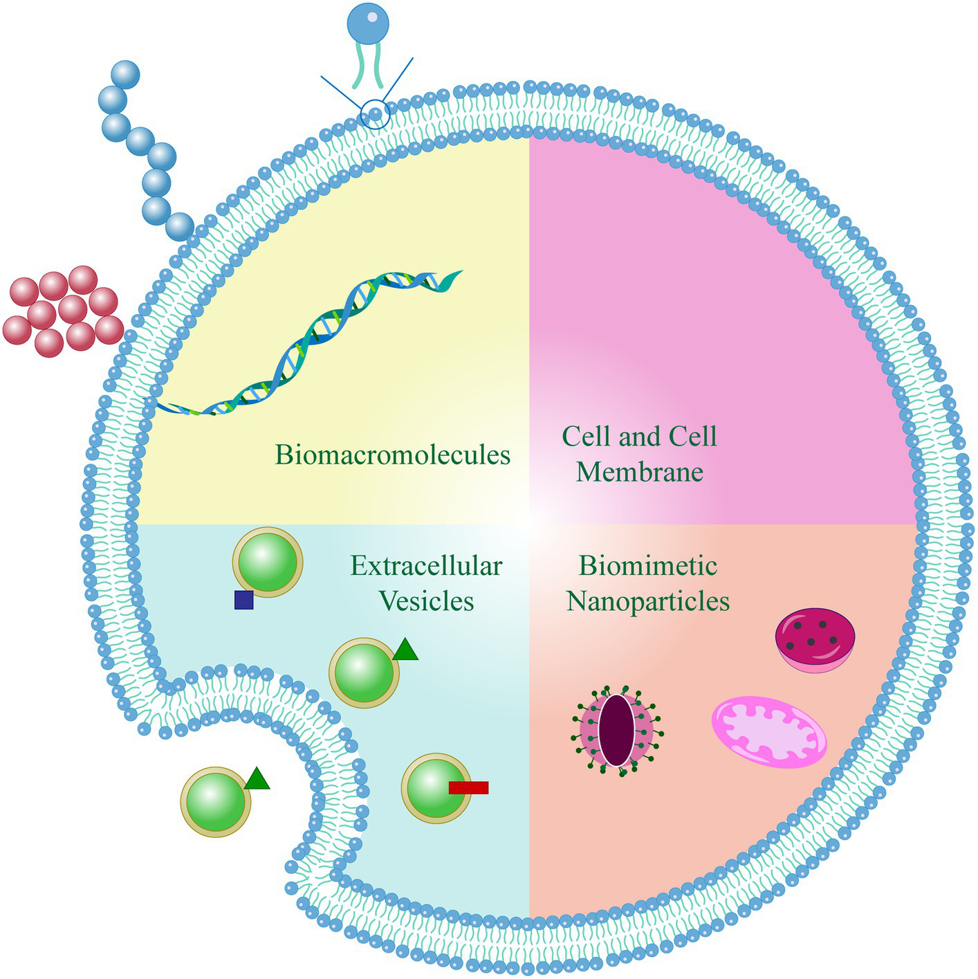 Based on the biological attributes of biomimetic units, natural biomimetic nano-systems offer three primary advantages: extended circulation within the body, precise targeting capabilities, and reduced toxicity. Currently, natural biomimetic nano-systems in the field of drug delivery for RA treatment including endogenous albumin, extracellular vesicles, cell membranes, and genetically engineered membranes. These innovative systems have demonstrated effectiveness in delivering therapeutic drugs or NPs to the affected joints, thereby enhancing the overall therapeutic outcome (Figure 2).