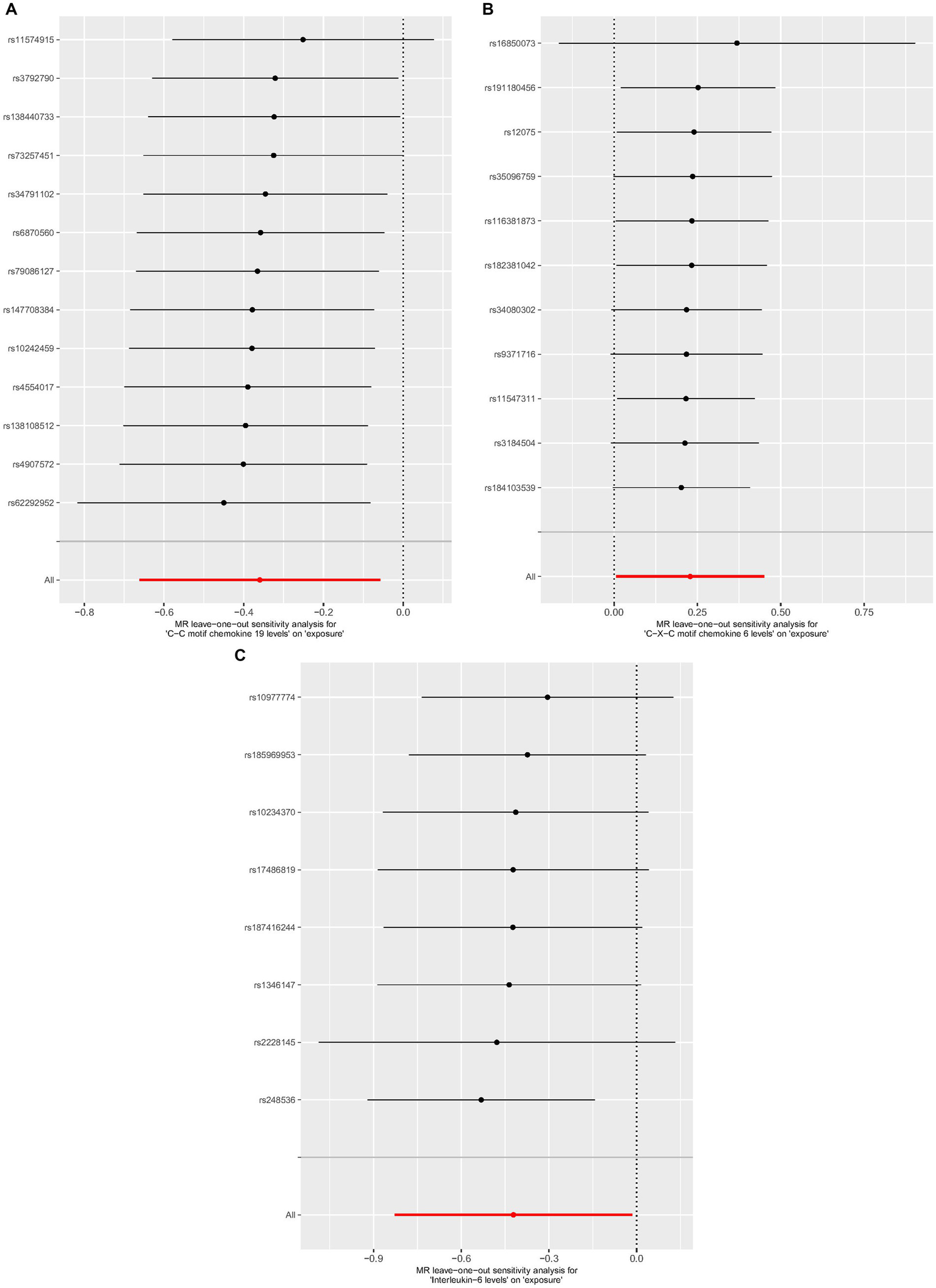 An overview of the causal effect of 91 cytokines taxa on vitiligo is shown in Figure 2. Of all the cytokines, three were selected for further MR analyses. Furthermore, 13 independent SNPs were associated with C-C motif chemokine 19 (CCL19), 11 independent SNPs were associated with C-X-C motif chemokine 6 (CXCL6), and 8 independent SNPs were associated with interleukin-6 (IL-6). SNP detailed messages (SD, R2, F) of significant genera in MR analyses are shown in Table 2.