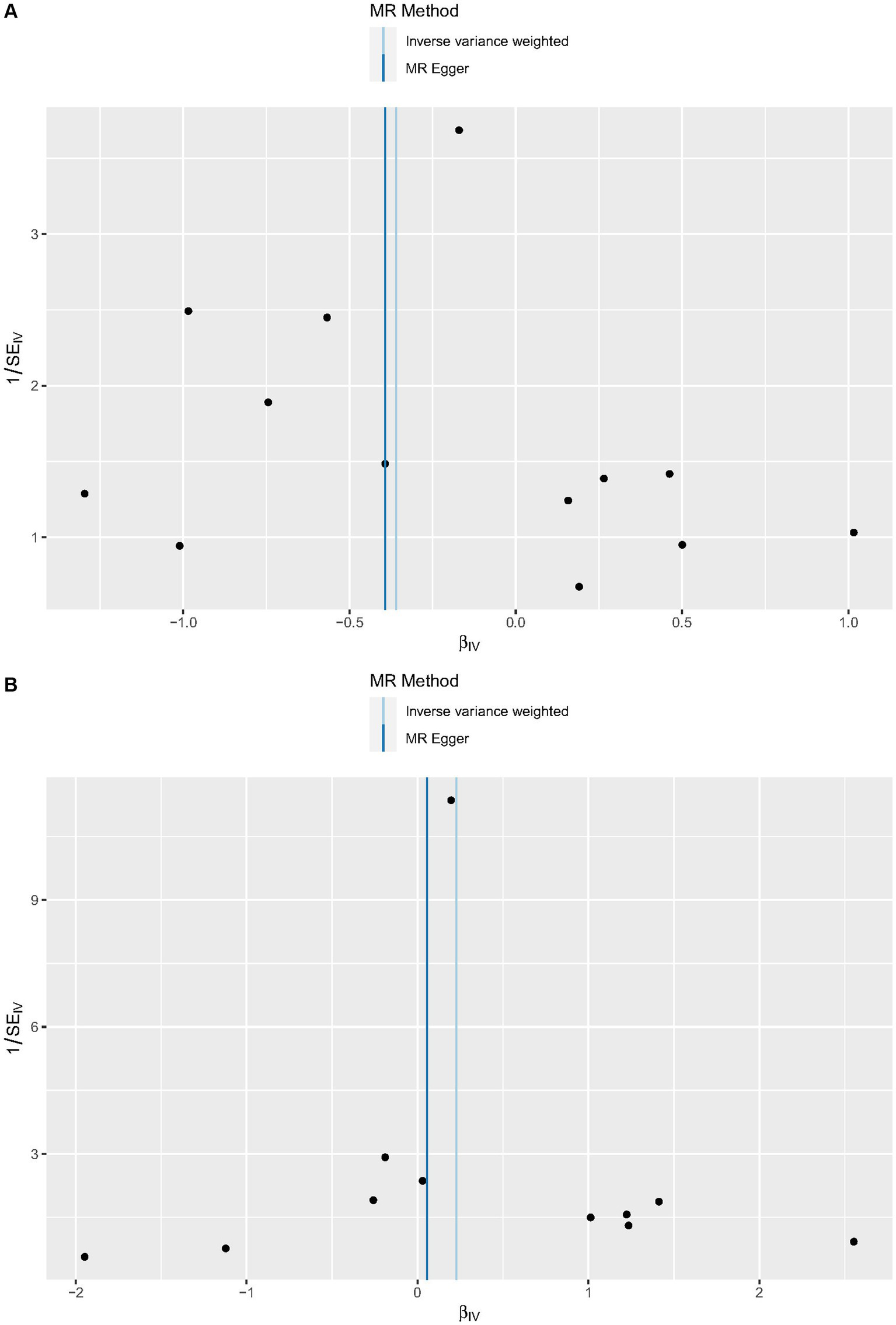 Following LD clumping and screening at a low threshold (p < 5 × 10−6), SNPs of cytokines were chosen. The resulting SNPs for the cytokine trait are presented in detail in Supplementary Table S1. Given that all of the F statistics for the IVs were more than 10, there was no minor instrument bias.