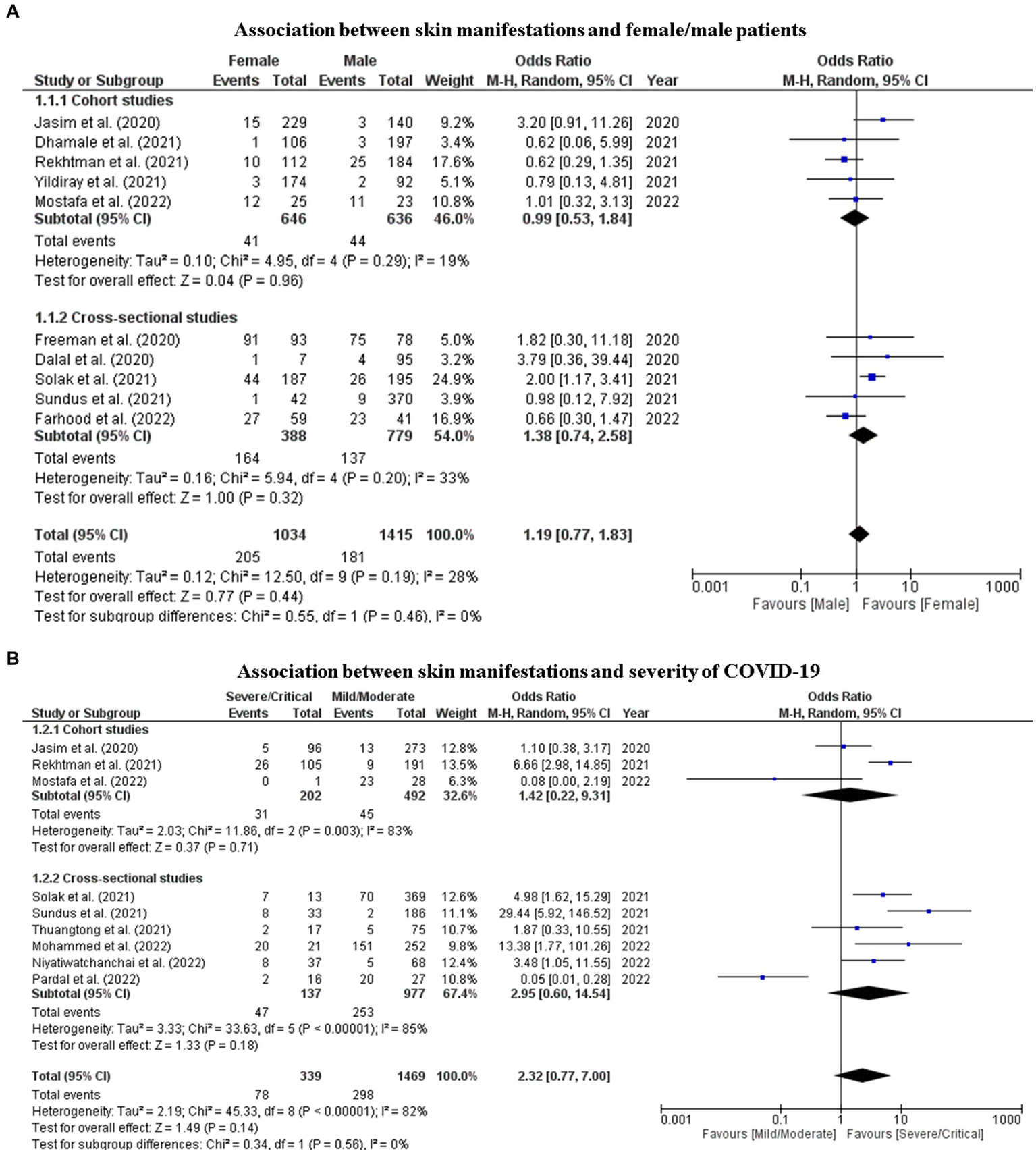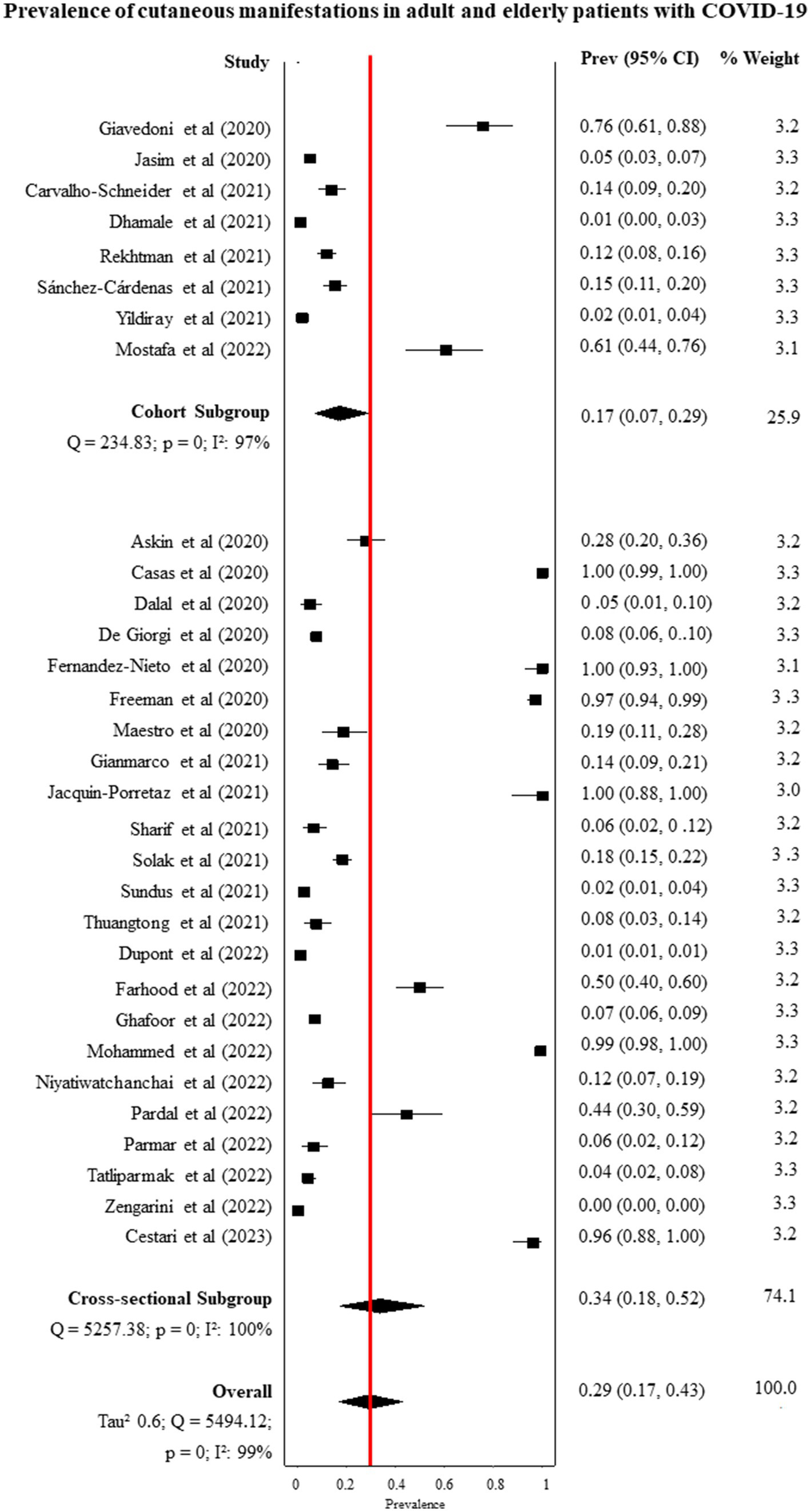 The primary outcome was the proportion of skin manifestations in adults and elderly patients with any laboratory test positive for COVID-19 and the estimation of 95% Confidence Intervals (95% CI). The following subgroup analyses were performed: (1) Prevalence of skin manifestations by continent in the world, (2) Prevalence by type of skin manifestation, (3) Prevalence of skin manifestations by morphological characteristics, (4) Prevalence by location of skin manifestation (part of the body), and (5) Individual and clinical characteristics of patients presenting with skin manifestations of COVID-19. The secondary outcome was the association of skin manifestations with (1) female and male patients and (2) the severity of COVID-19.
