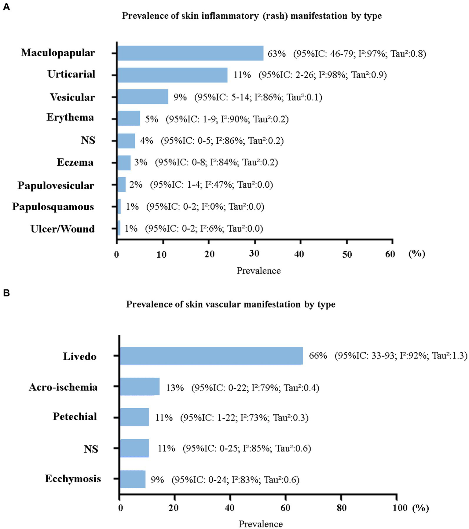 Only two studies did not report the characteristics of the skin manifestations (24, 33). Considering the total number of skin manifestations developed by patients who tested positive for COVID-19 (n = 1,343), we evaluated the relative frequency by lesion characteristics using a proportion meta-analysis (Figure 4A). Inflammatory manifestations were the most prevalent (63%) and were all classified as rashes. Lesions of vascular origin occurred in 9% of cases, followed by chilblain-like lesions (5%) and pernio-like lesions (2%). All proportions showed high heterogeneity (I2 > 78% and p = 0).
