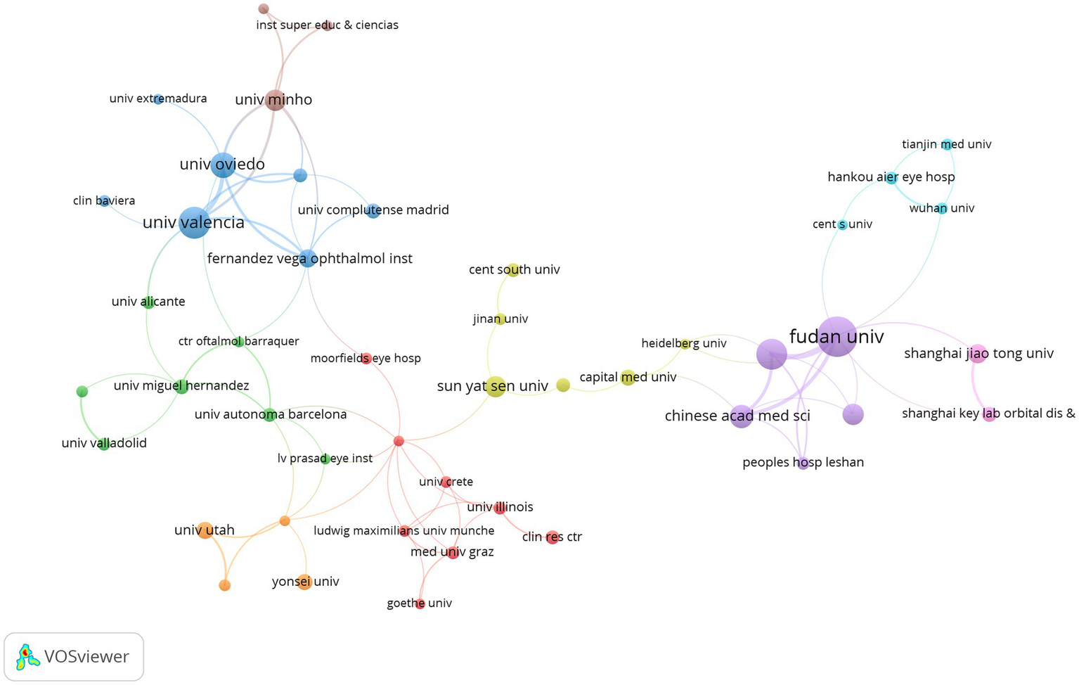 The 791 articles identified using WoSCC were published across 822 institutions. The top 10 institutions involved in posterior chamber pIOL research contributed 386 articles, accounting for 48.8% of the total publications (Table 2). Regarding publication count, Fudan University had the highest number of publications (68 articles, 8.6%, China), followed by Kitasato University (52 articles, 36.6%, Japan) and the University of Valencia (44 articles, 5.6%, Spain). With respect to publication impact, Kitasato University’s articles received the highest number of citations (1,657 citations, 13%, Japan), followed by the University of Valencia (1,138 citations, 8.9%, Spain) and the University of Oviedo (907 citations, 7.1%, Spain). Figure 5 shows the collaborative network of research institutions generated using coauthor analysis. The size of each node represents the number of articles published by the respective research institution, and the links between nodes indicate collaboration. The strength of these links reflects the intensity of cooperation.