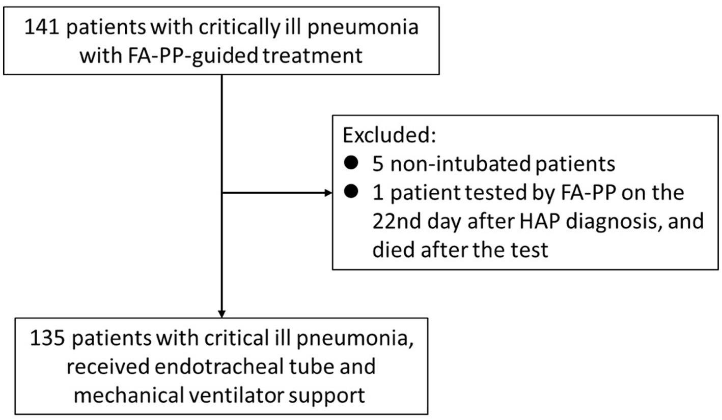 Data were initially collected from 141 patients between July 2021 and July 2022. The exclusion criteria were applied as follows: five patients were excluded for not receiving tracheal intubation therapy; one outlier was excluded because the FA-PP test was performed 22 days after being diagnosed with HAP, and the patient died after the FA-PP test was conducted. Finally, 135 patients were enrolled in this study (Figure 1). An overview of the basic characteristics and clinical outcomes of the 135 patients who underwent FA-PP testing for pathogens and received mechanical ventilation support at the time of enrollment was shown in Table 1. The patient cohort had an average age of 67.10 ± 13.92 years, with 69.6% male. Of the 135 patients, 38.5% had a prior history of smoking, and the averages of severity indexes, including APACHE-II score, SOFA score, and serum lactate, were 30.62 ± 8.46, 11.23 ± 3.88, and 4.50 ± 4.19, respectively. Community-acquired pneumonia accounted for 42.2% of pneumonia cases, whereas HAP accounted for 37.0%. The time interval between pneumonia diagnosis and FA-PP implementation was 1.90 ± 1.62 days, and the average length of MICU stay was 19.42 ± 12.93 days. The overall in-hospital mortality rate was 50.4%.