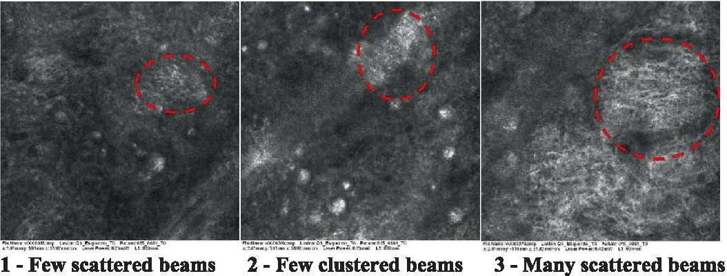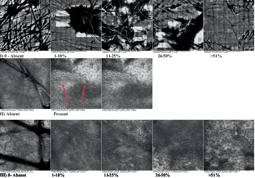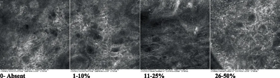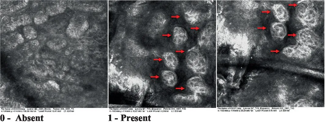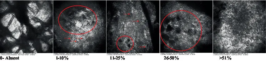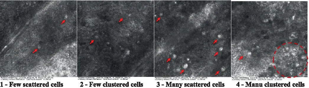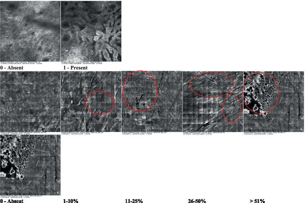 The information on the 18 attributes found in the literature, with nomenclature, definitions, and layers where they can be visualized are described in Table 1. The proposed score and its levels are described in Table 2, in which RCM images were gathered on a Photographic Scale, and organized according to 18 of the attributes of cellular transformation with the participant’s samples.