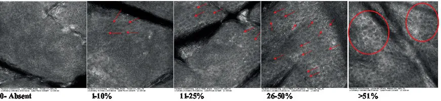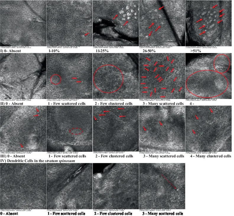 | 10 | Inflammatory cells in the basal layer | Presence of small and scattered refractable cells in the basal layer | Epidermis, basal layer | (55) |