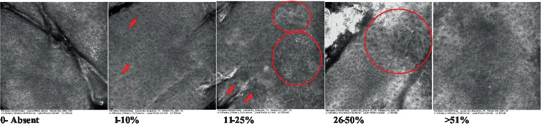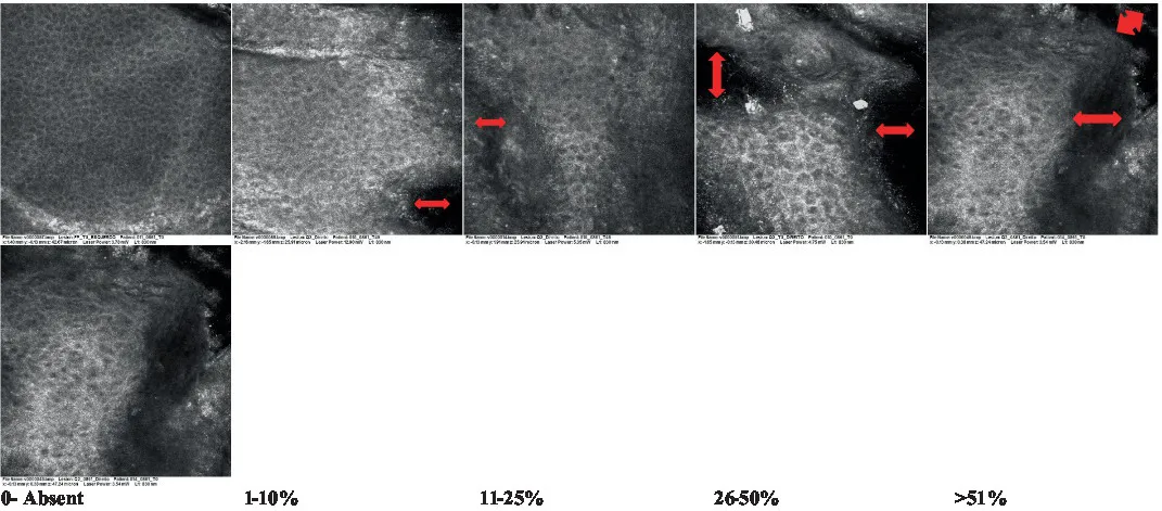A table detailing the 18 attributes of AK, and a photographic scale containing RCM images graded by scores established for each characteristic and the frequency of spreading were developed. The results of the validation presented good repeatability, correlation with clinical evaluation, and capacity for differentiating treatments demonstrated by the significant improvement after topical treatment by the reduction of the score for 10 out of the 18 attributes. The preliminary study, evaluated by the detailed transformation scale highlights important differences in the subclinical approach that allows a deeper evaluation of the aspects of the lesion’s re-incidence even after fully treated skin sites.