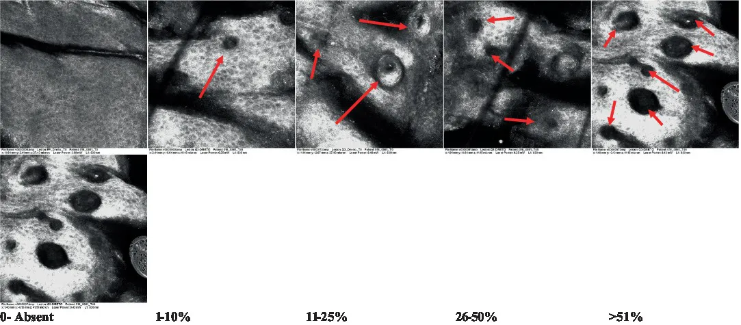 | 8 | Atypical keratinocytes with follicular coverage | Dark openings with great refraction of surrounding cells | Epidermis, spinous layer (stratum spinosum), and basal layer | (61) |