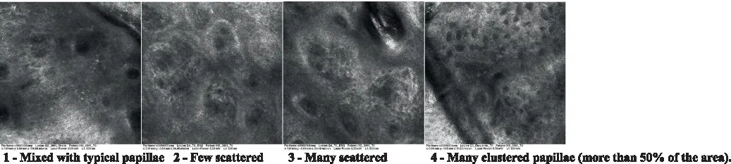 Presence and spreading of entangled fibers and dense material around the papillae. Poorly defined papillae |
