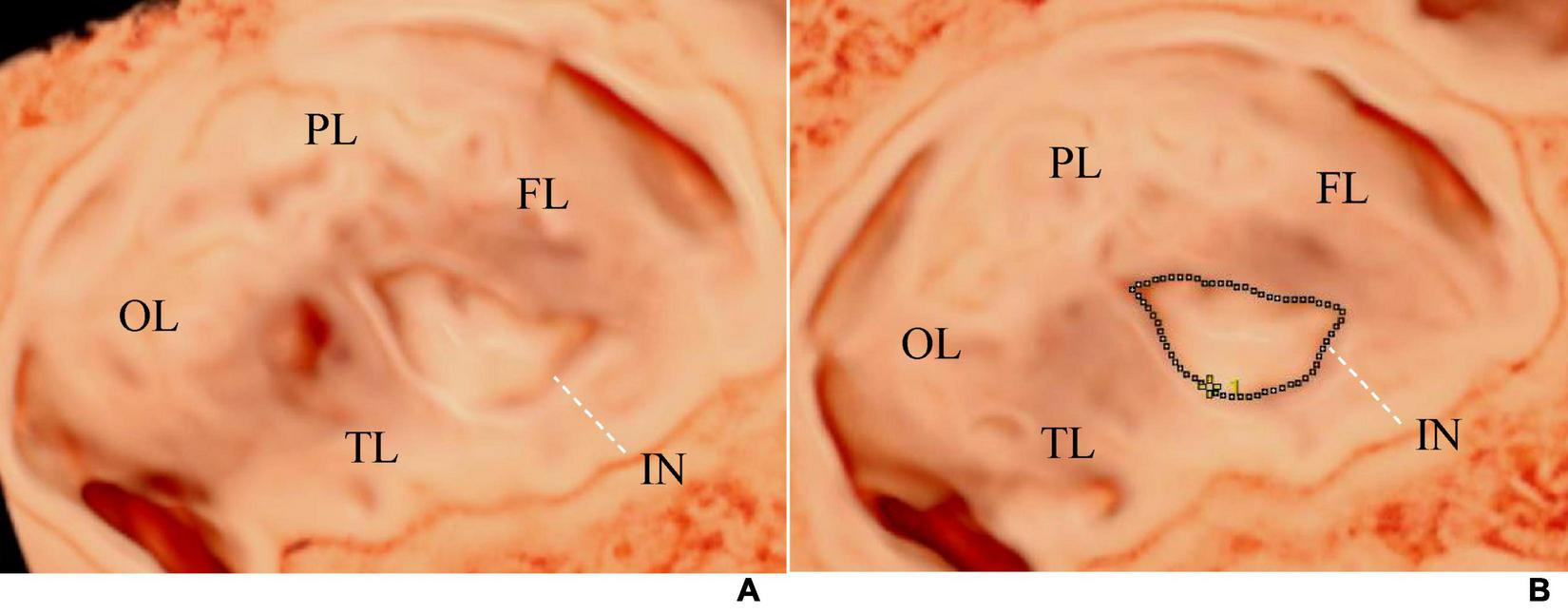 (A) Shows the visualization image of the AGA fetal insula at 32 weeks of gestation, and (B) demonstrates the method of measuring the insular area and circumference. The tracing method was used to draw a line along the edge of the insula to measure its area and circumference. The dashed line represents the tracing line. FL, frontal lobe; PL, parietal lobe; OL, occipital lobe; TL, temporal lobe; IN, insula.