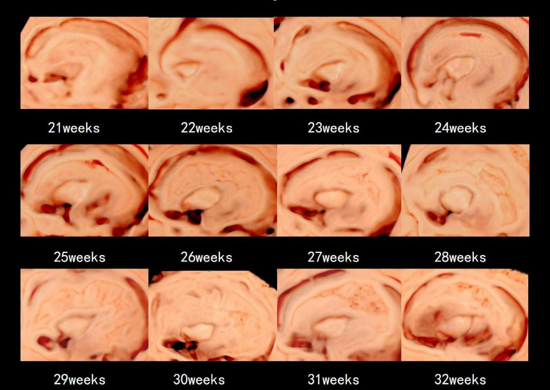 The 3D-ICRV sonographic characteristics of the insular cortex. Images are taken from individual fetuses rather than longitudinal assessment in one fetus.